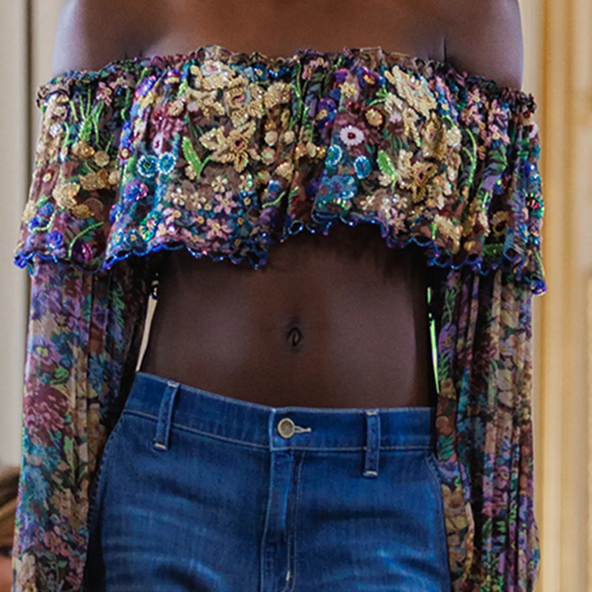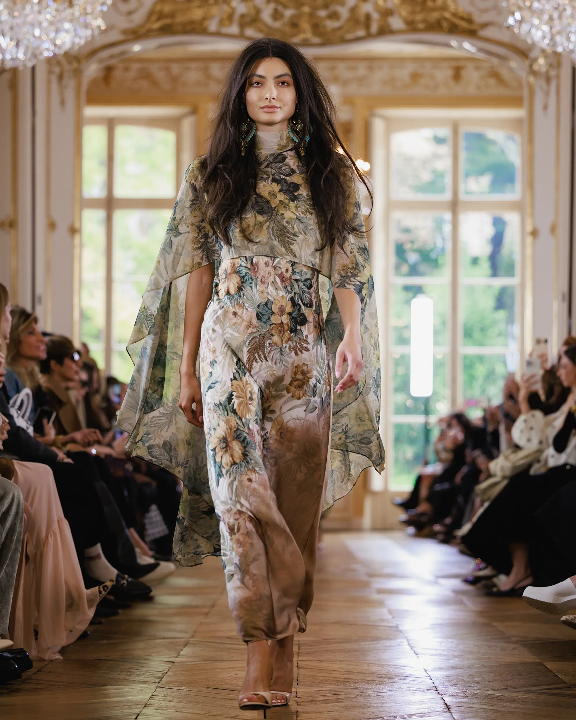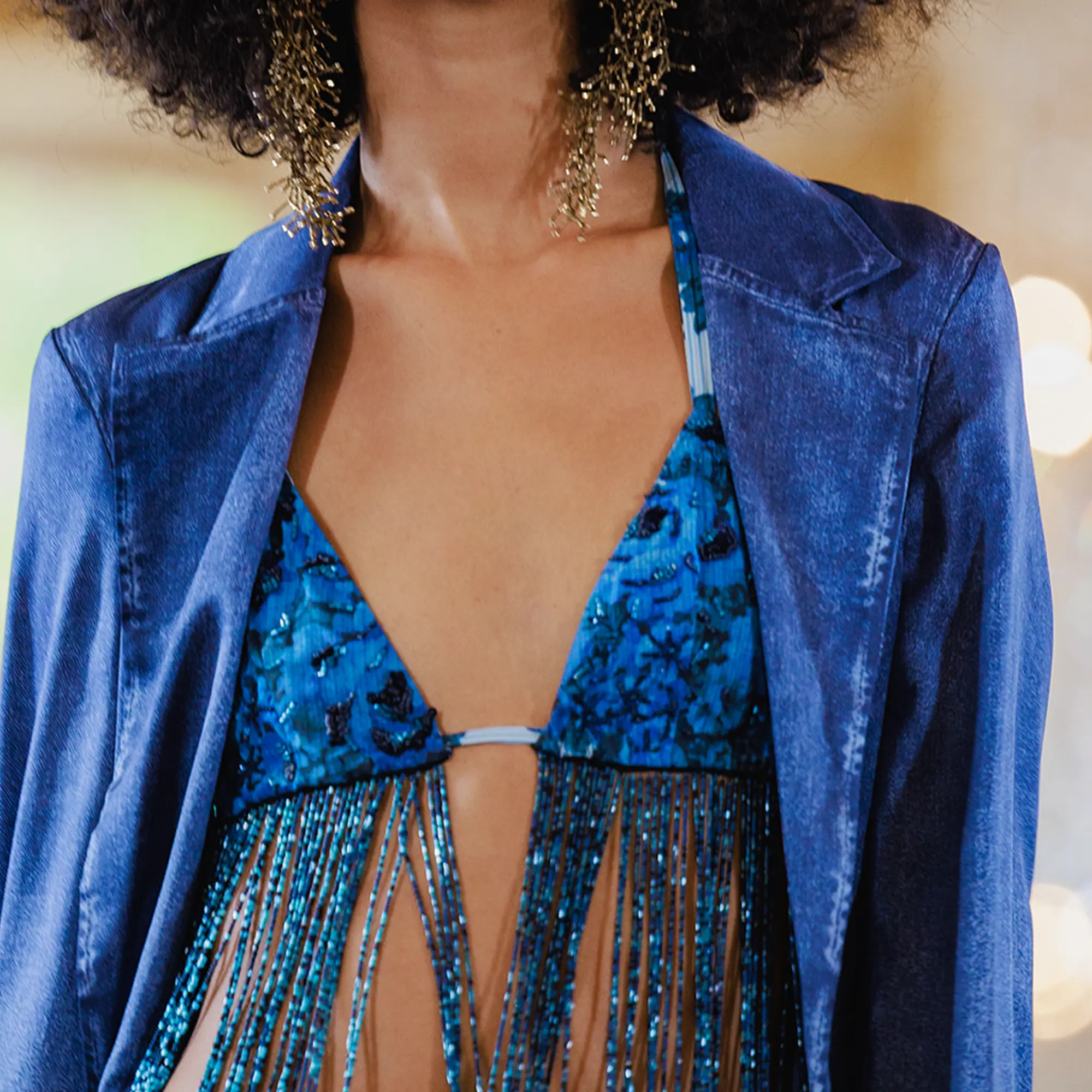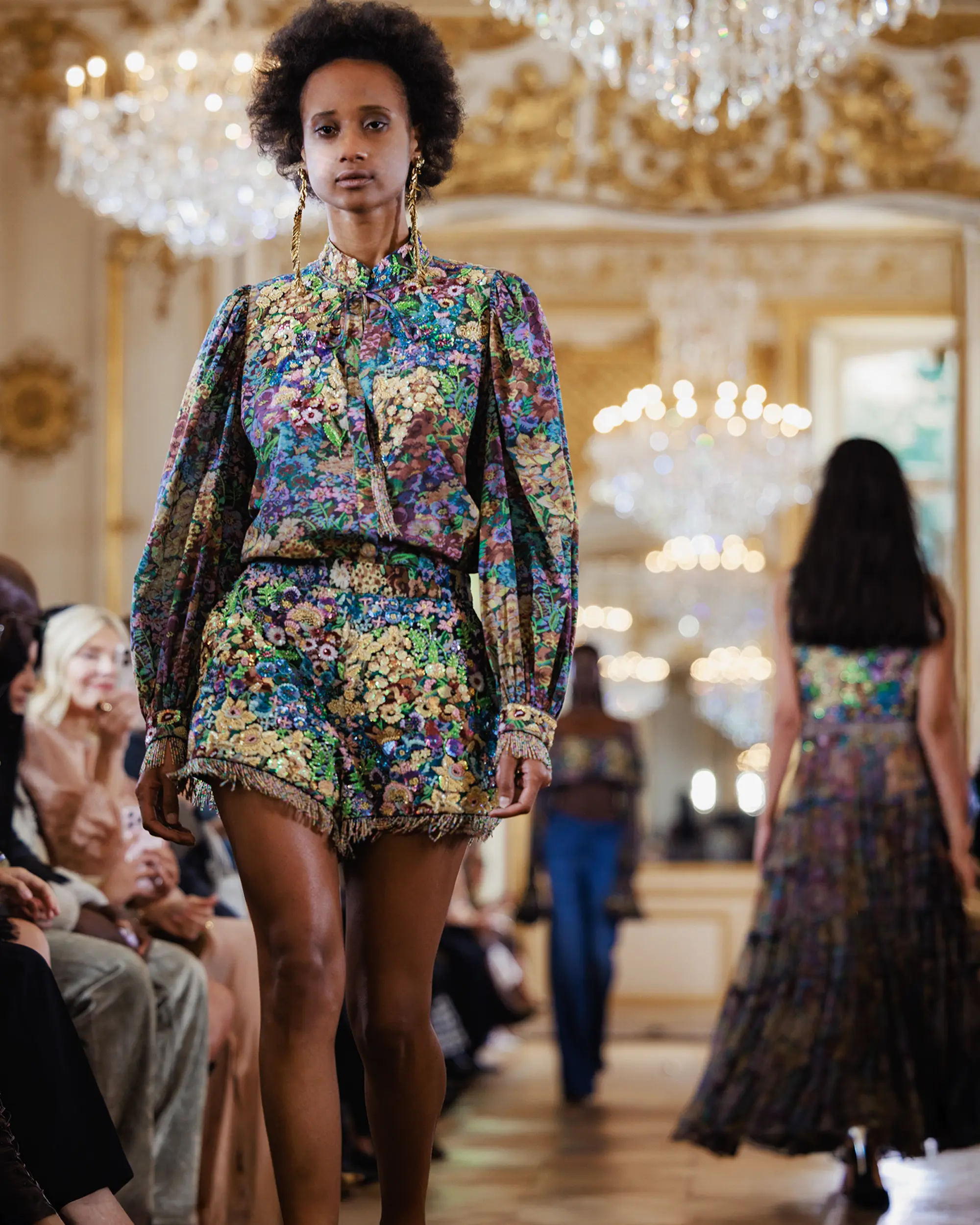质感与动感是 Halperin 叙事的核心。薄纱刺绣礼服轻盈飘动,宛若诗意;剪裁利落的马甲与闪耀裤装套装则为整体增添了建筑般的平衡感。即便是靛蓝牛仔,也因 Halperin 精准的工艺而变得更为摩登。印花哈伦裤随步伐微微摆动,散发低调感性的魅力;而刺绣花朵、闪亮珠饰与轻软流苏在波希浪漫与现代精致之间构筑起一场对话。