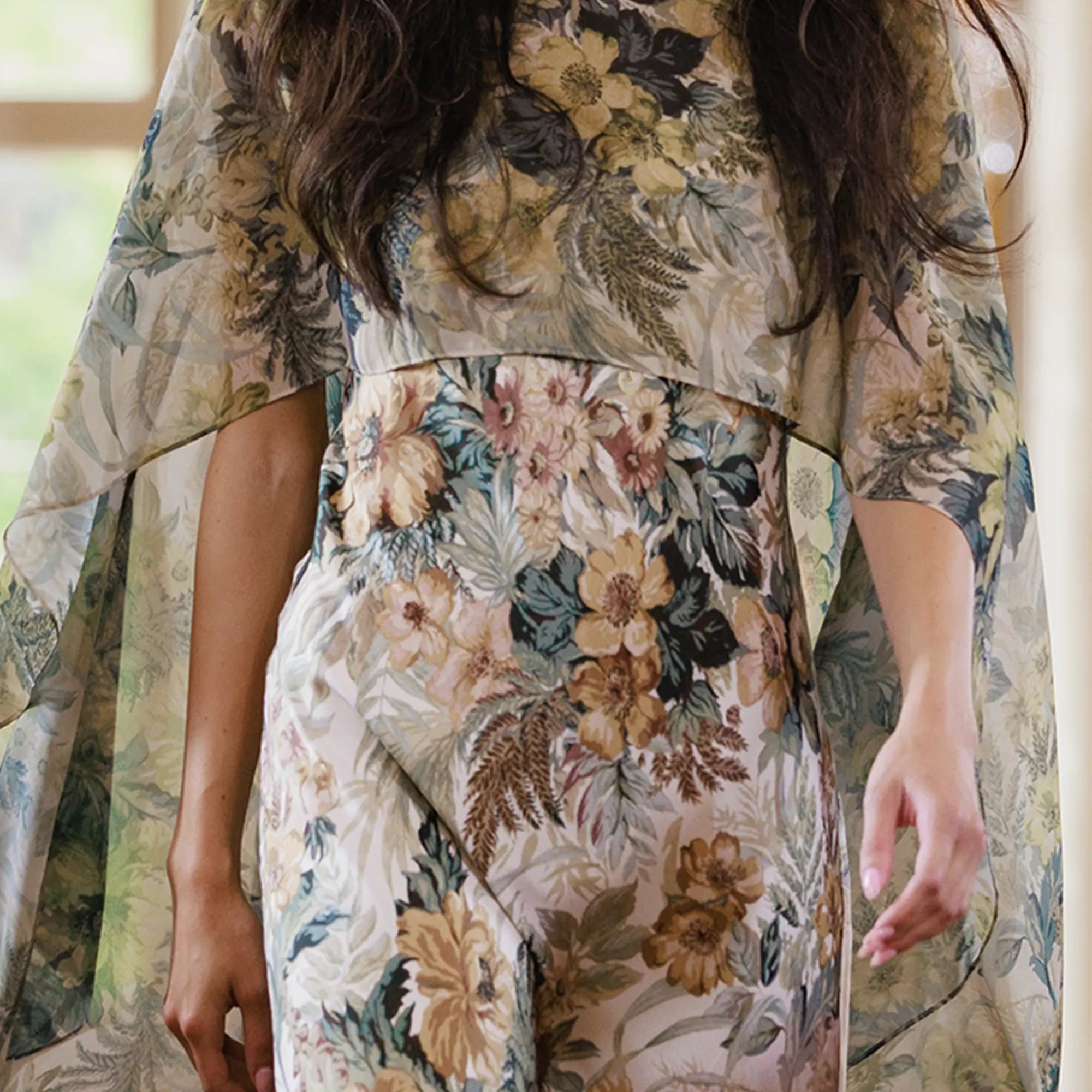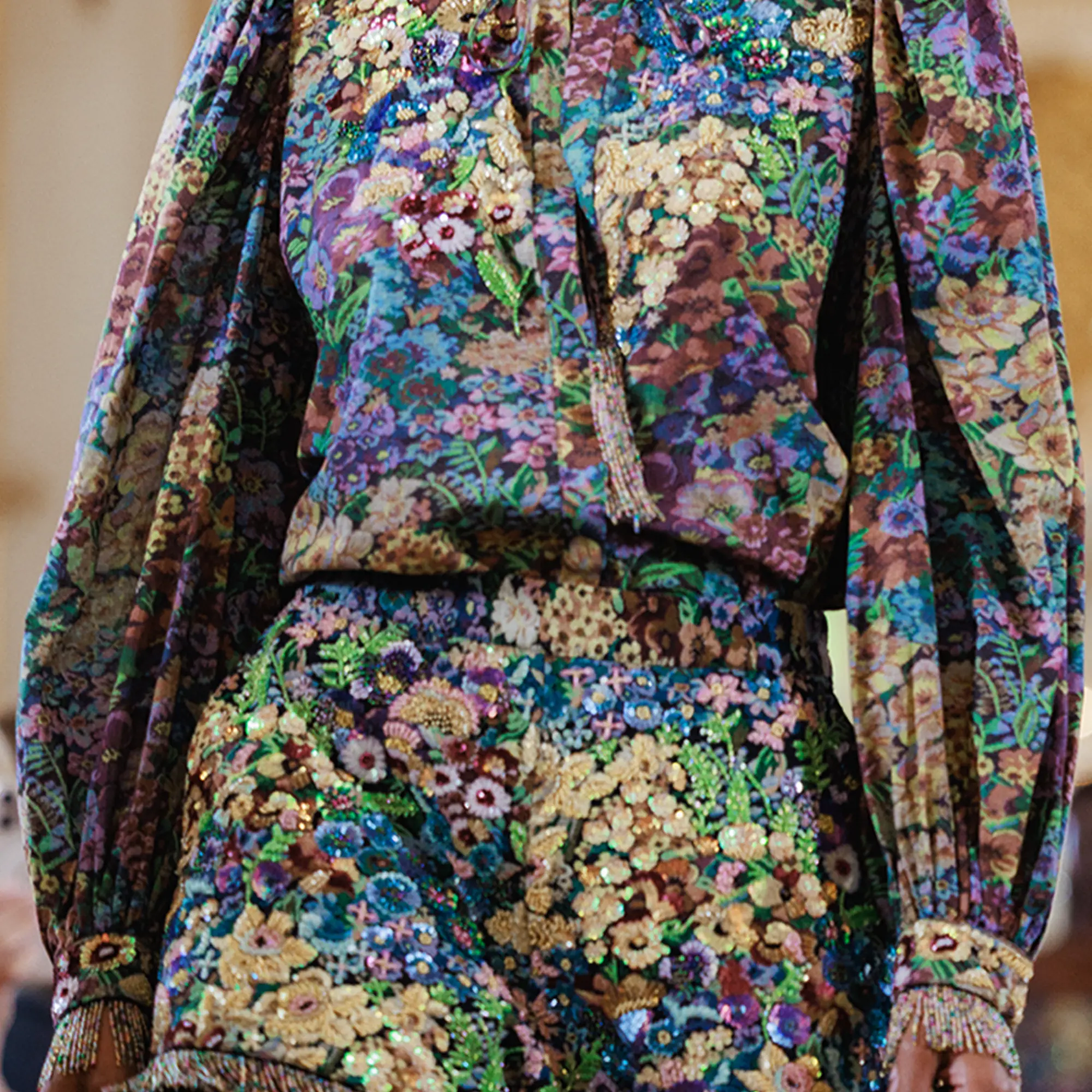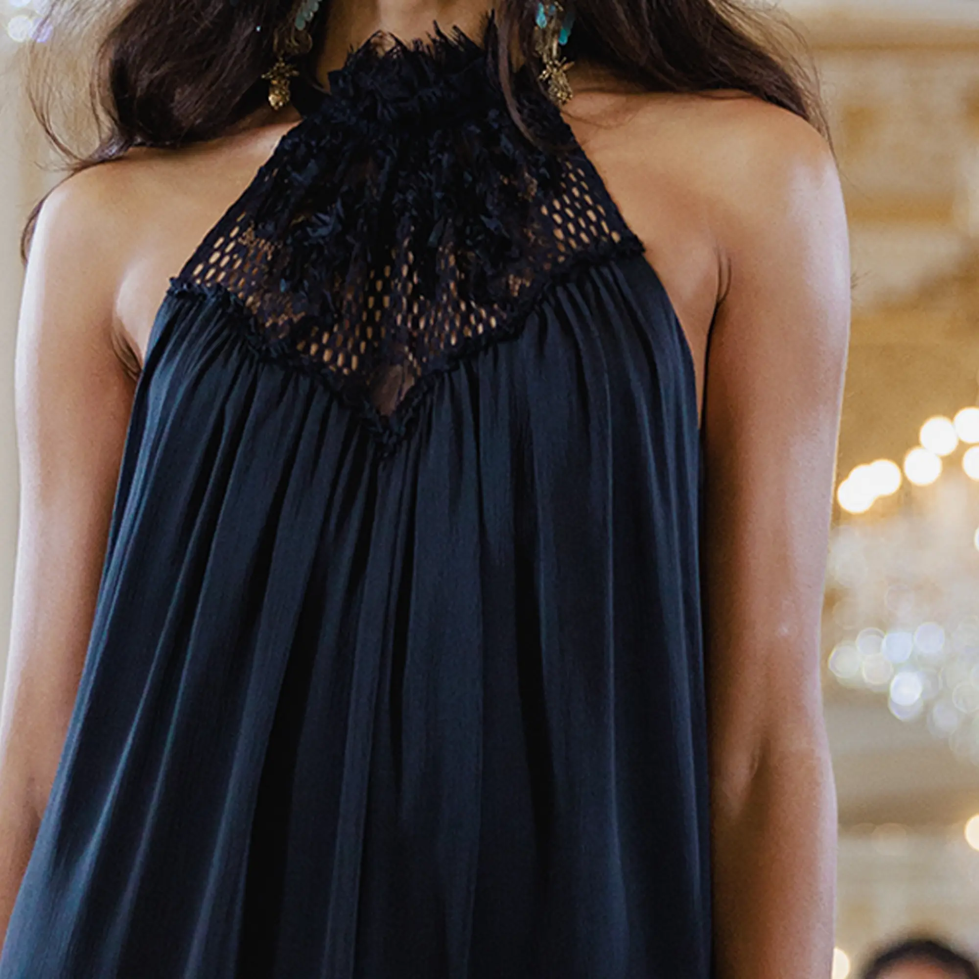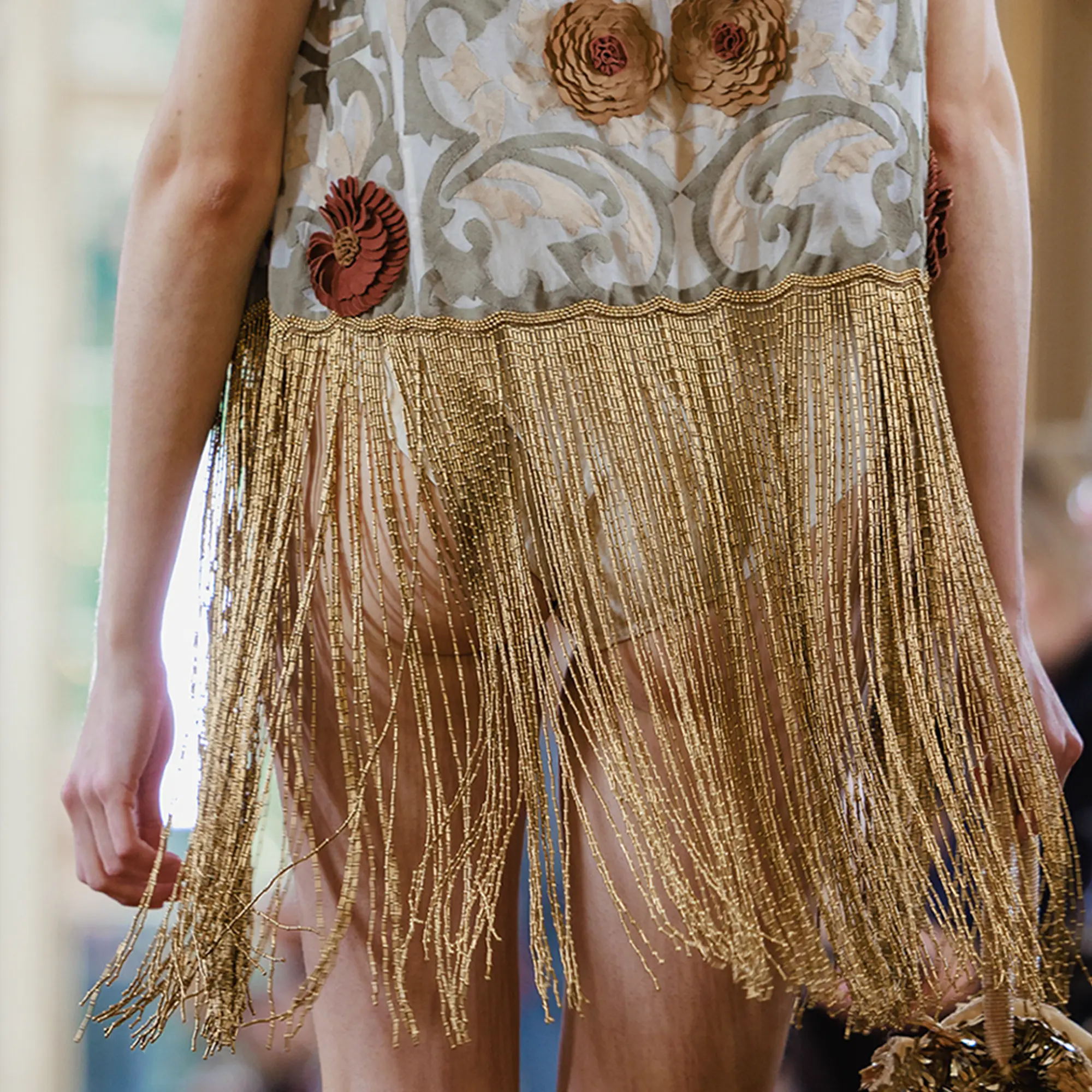 质感与动感是 Halperin 叙事的核心。薄纱刺绣礼服轻盈飘动,宛若诗意;剪裁利落的马甲与闪耀裤装套装则为整体增添了建筑般的平衡感。即便是靛蓝牛仔,也因 Halperin 精准的工艺而变得更为摩登。印花哈伦裤随步伐微微摆动,散发低调感性的魅力;而刺绣花朵、闪亮珠饰与轻软流苏在波希浪漫与现代精致之间构筑起一场对话。