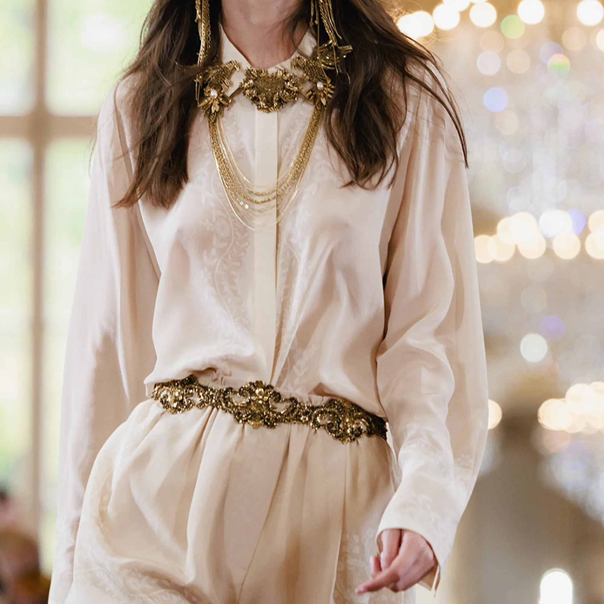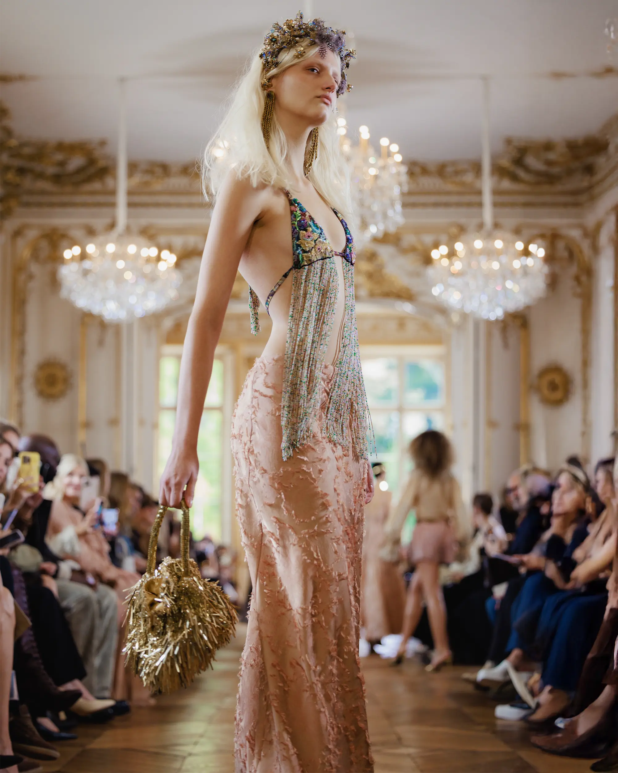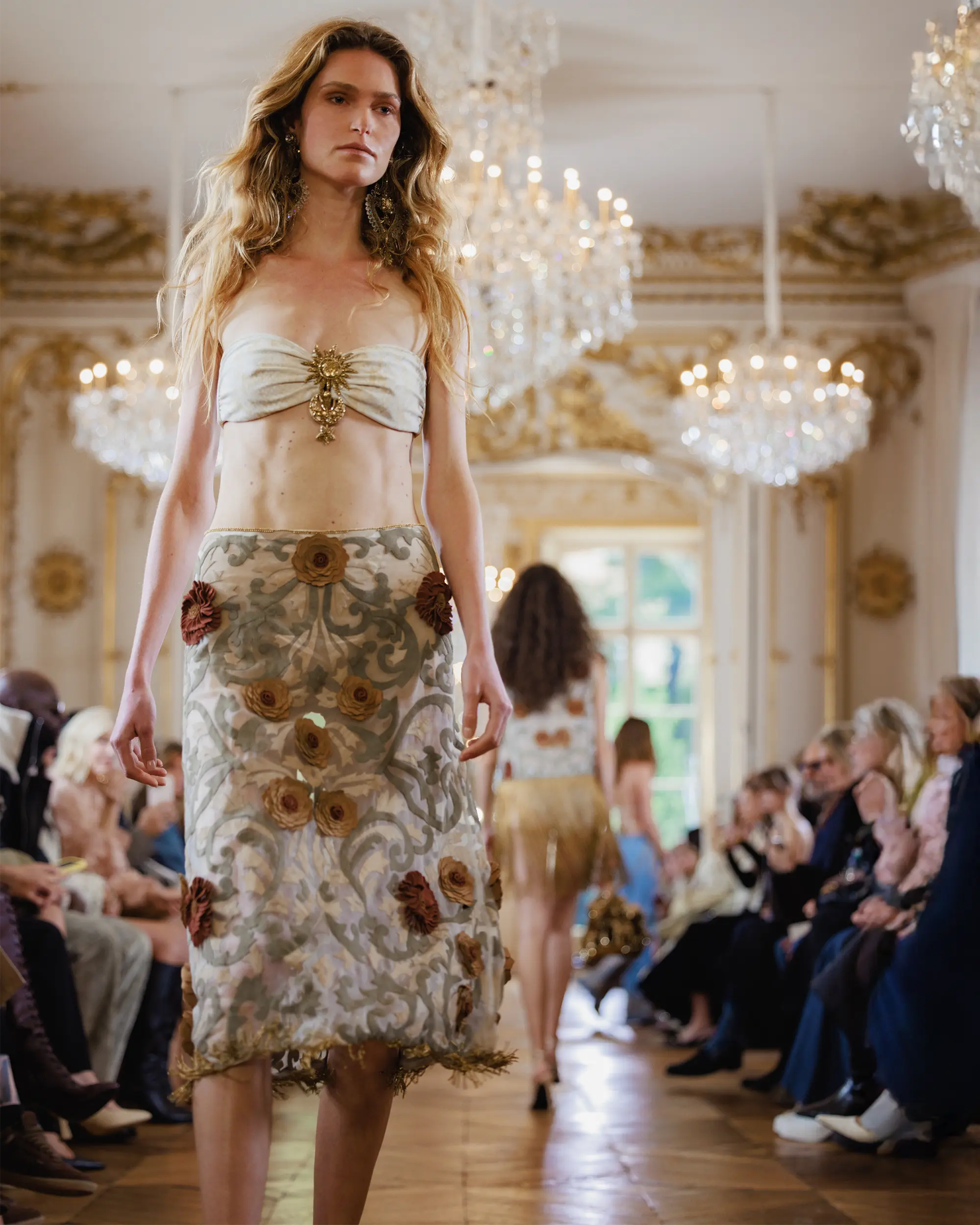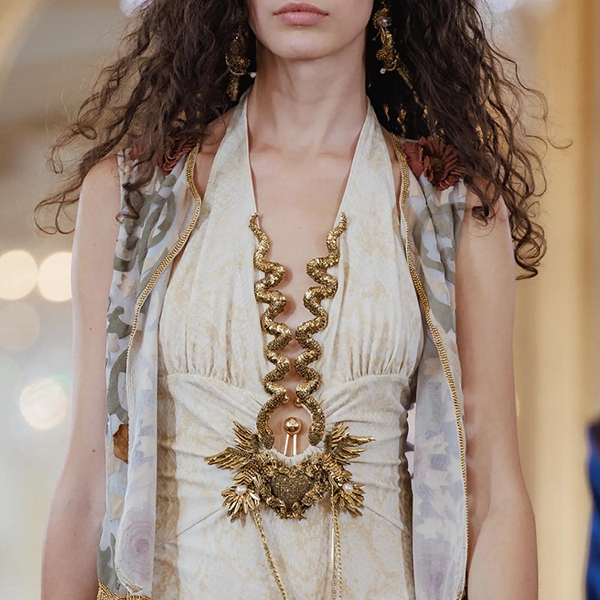 配饰则进一步强化了这一蜕变的主题。蛇形皮带与金色盘绕式珠宝仿佛象征着重生与自我觉醒;雕塑感的皇冠式头饰亦呼应主题——将波希风格升华为现代而大胆的宣言。与 Maison Ernest Paris 在鞋履上的合作、以及与 Deepa Gurnani 在珠宝上的合作,皆彰显 Halperin 对工艺的追求,精准诠释他所坚持的“智慧奢华”:欧洲格调、手工织物与匠心装饰,以现代且易于接触的方式呈现。