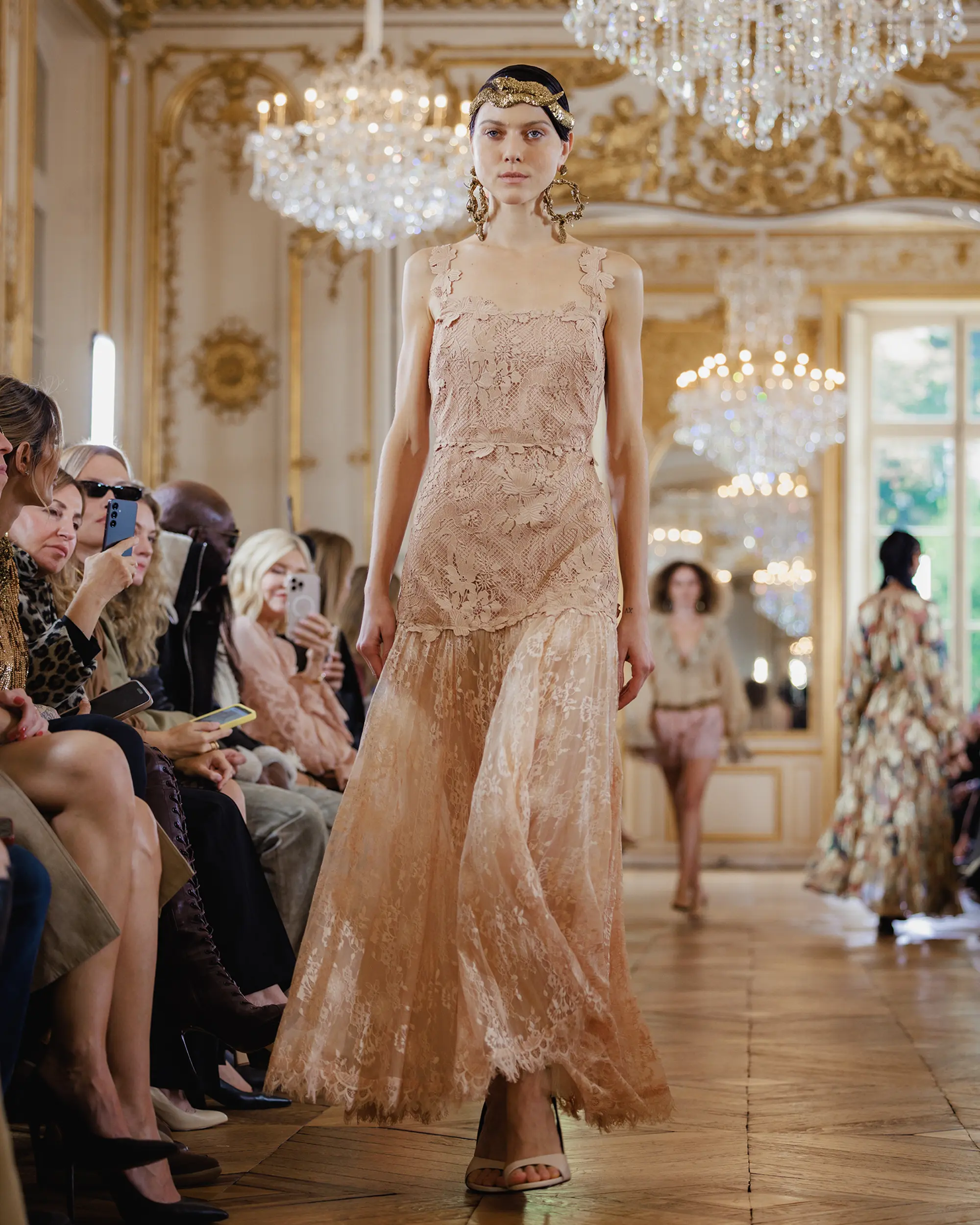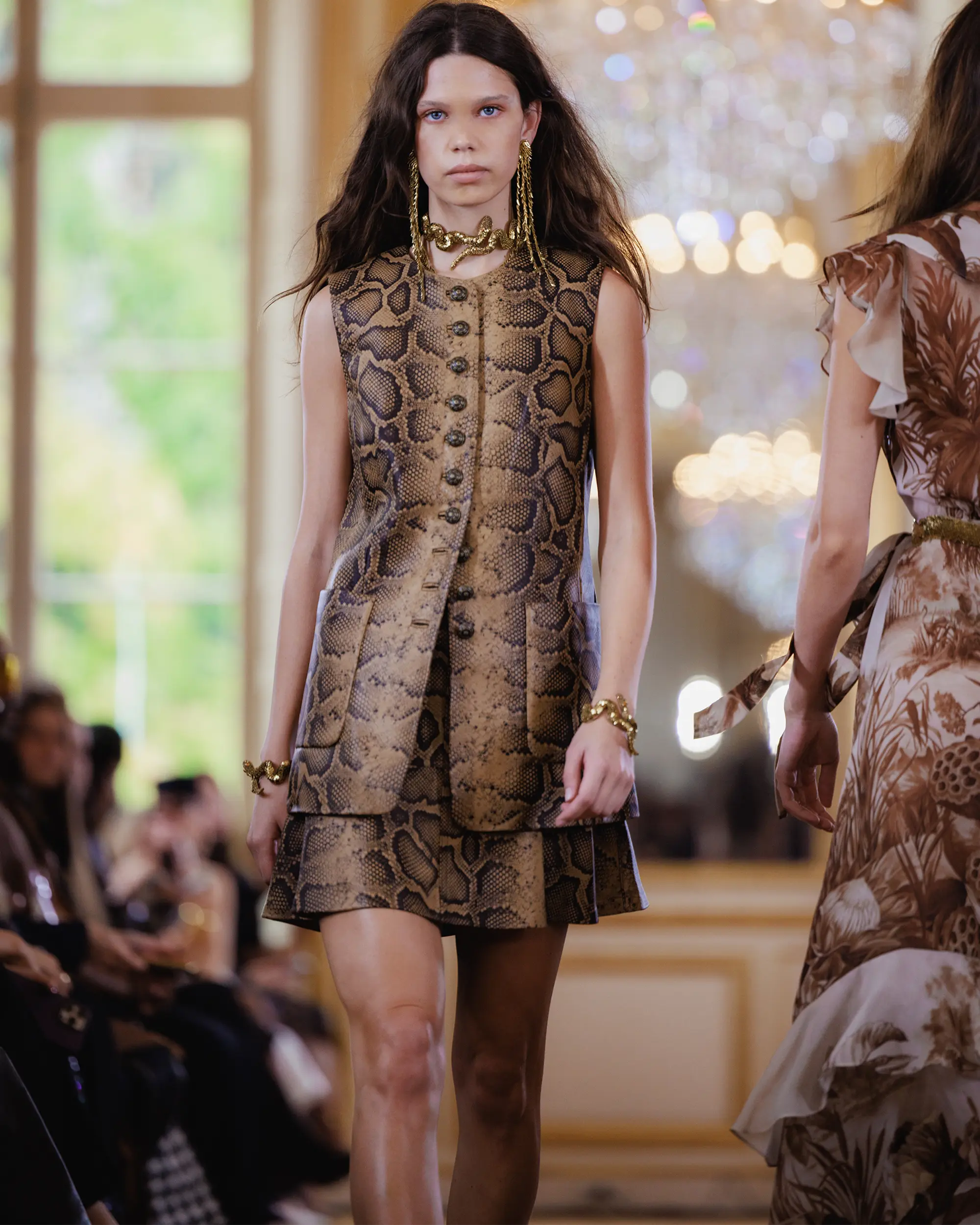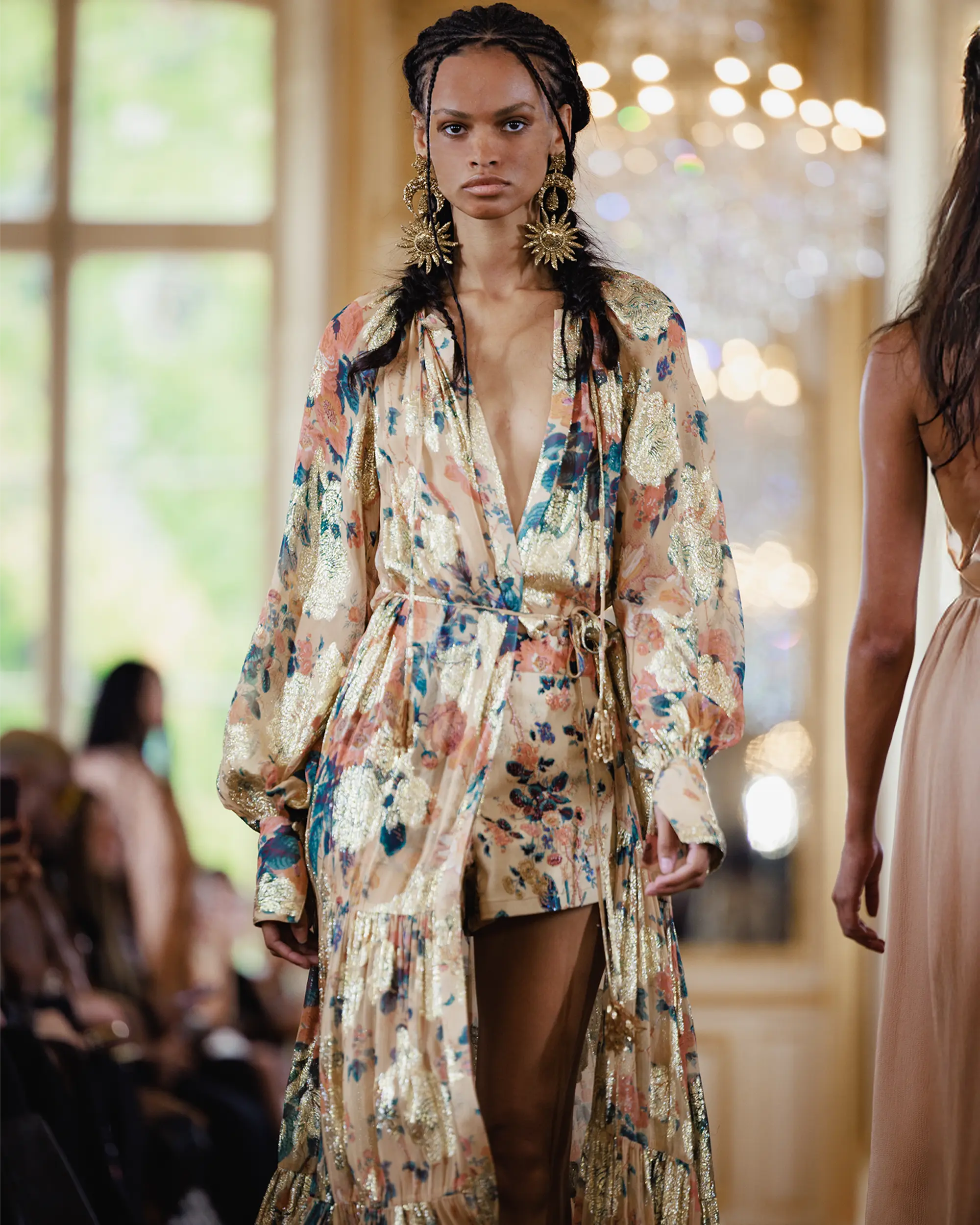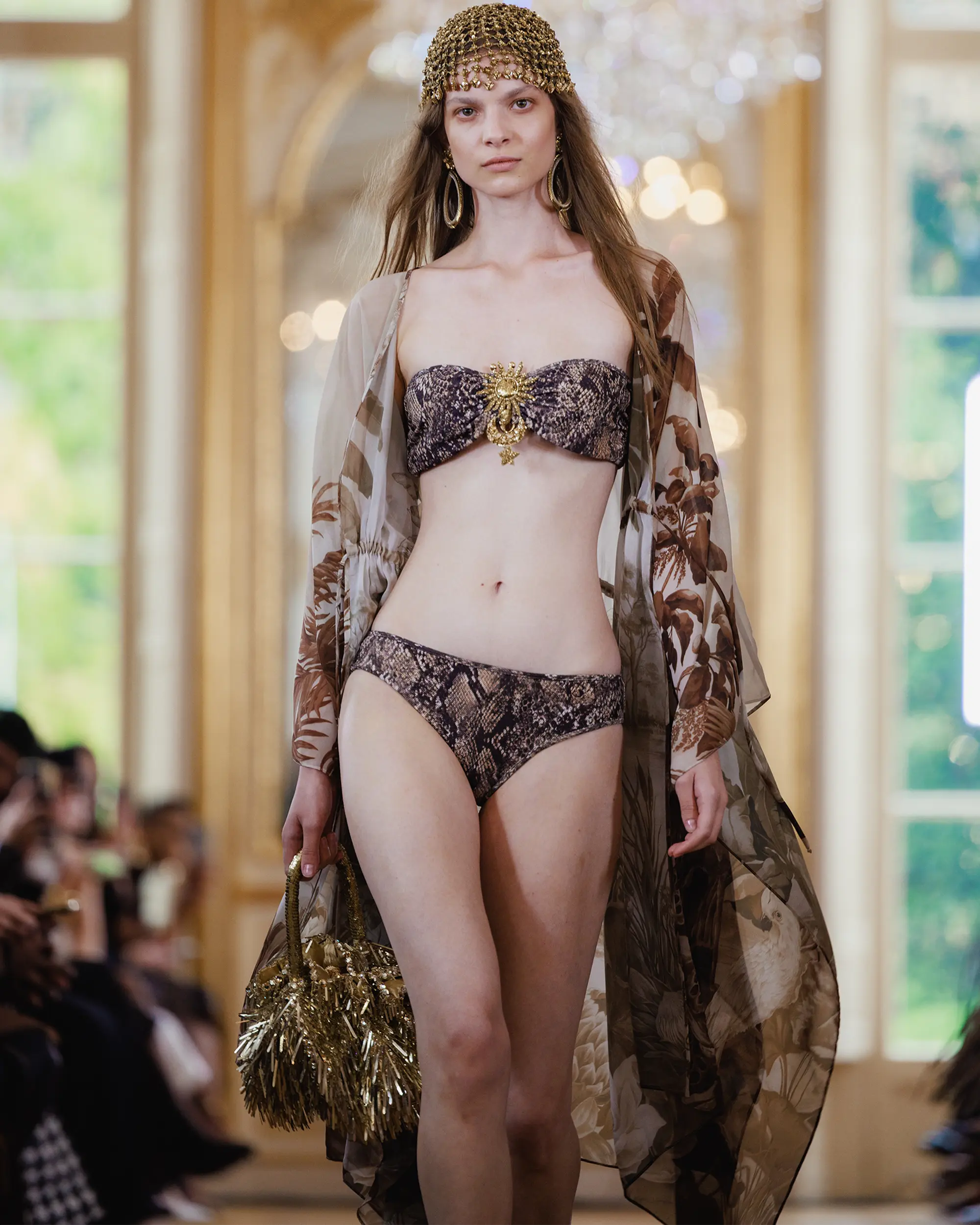 配饰则进一步强化了这一蜕变的主题。蛇形皮带与金色盘绕式珠宝仿佛象征着重生与自我觉醒;雕塑感的皇冠式头饰亦呼应主题——将波希风格升华为现代而大胆的宣言。与 Maison Ernest Paris 在鞋履上的合作、以及与 Deepa Gurnani 在珠宝上的合作,皆彰显 Halperin 对工艺的追求,精准诠释他所坚持的“智慧奢华”:欧洲格调、手工织物与匠心装饰,以现代且易于接触的方式呈现。