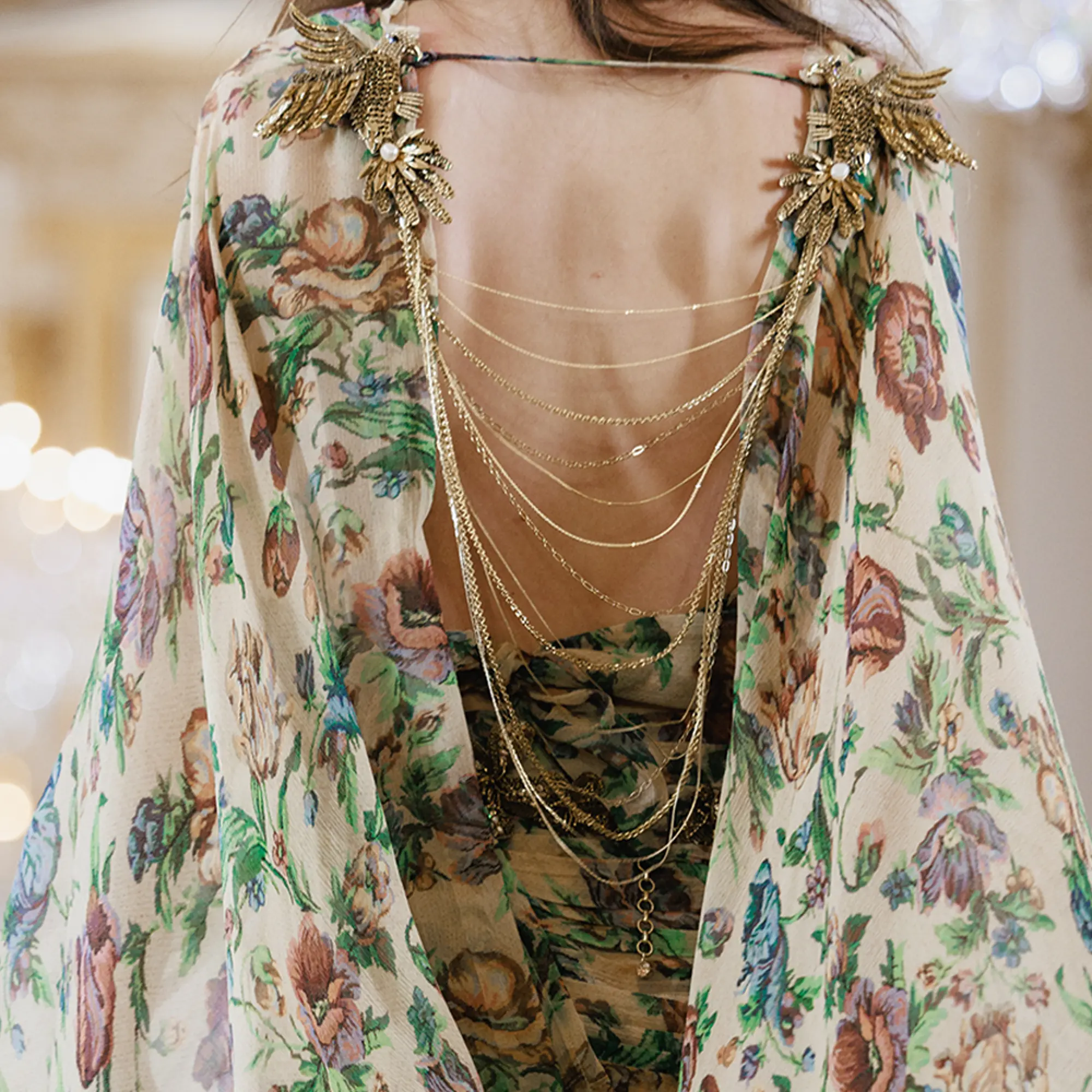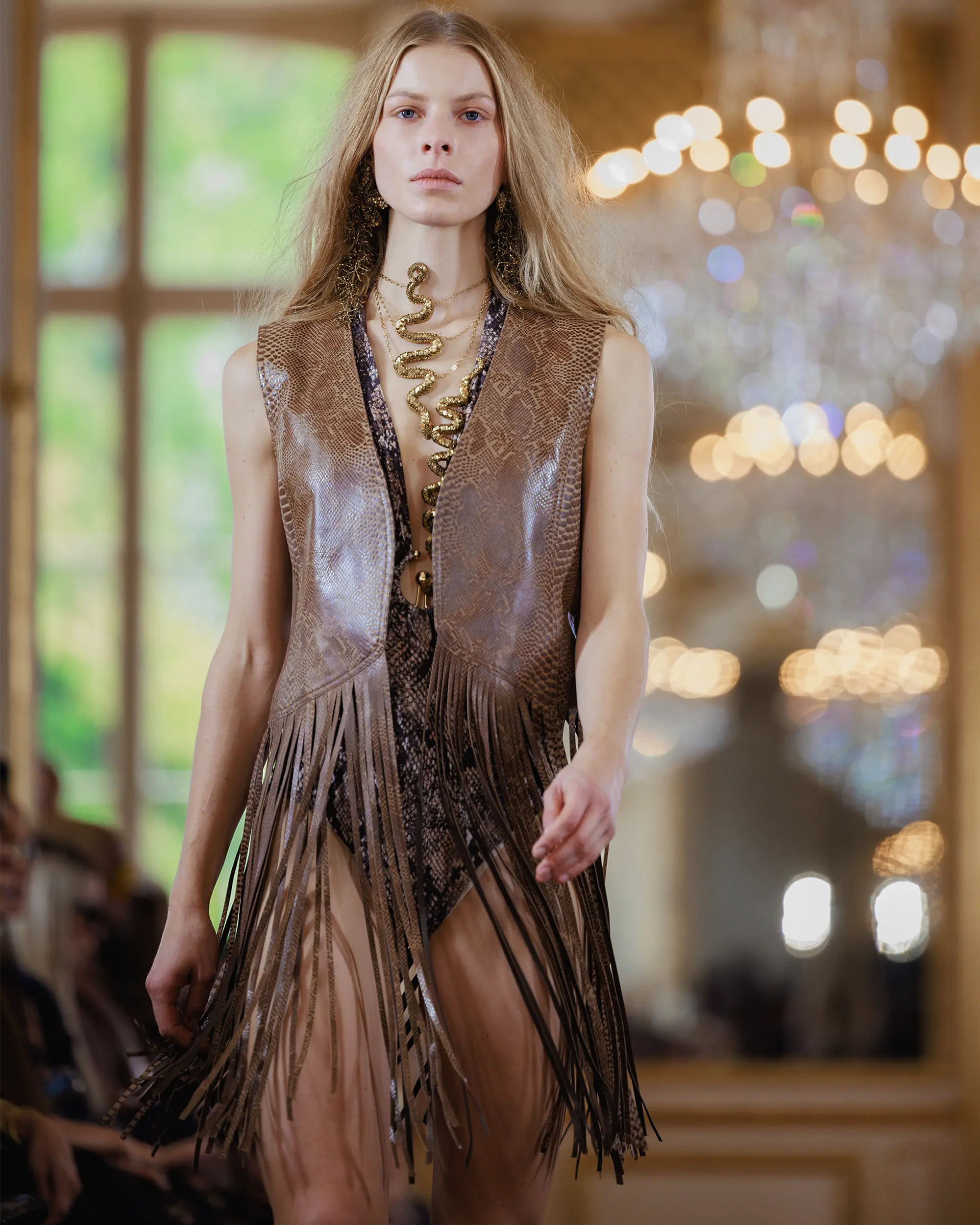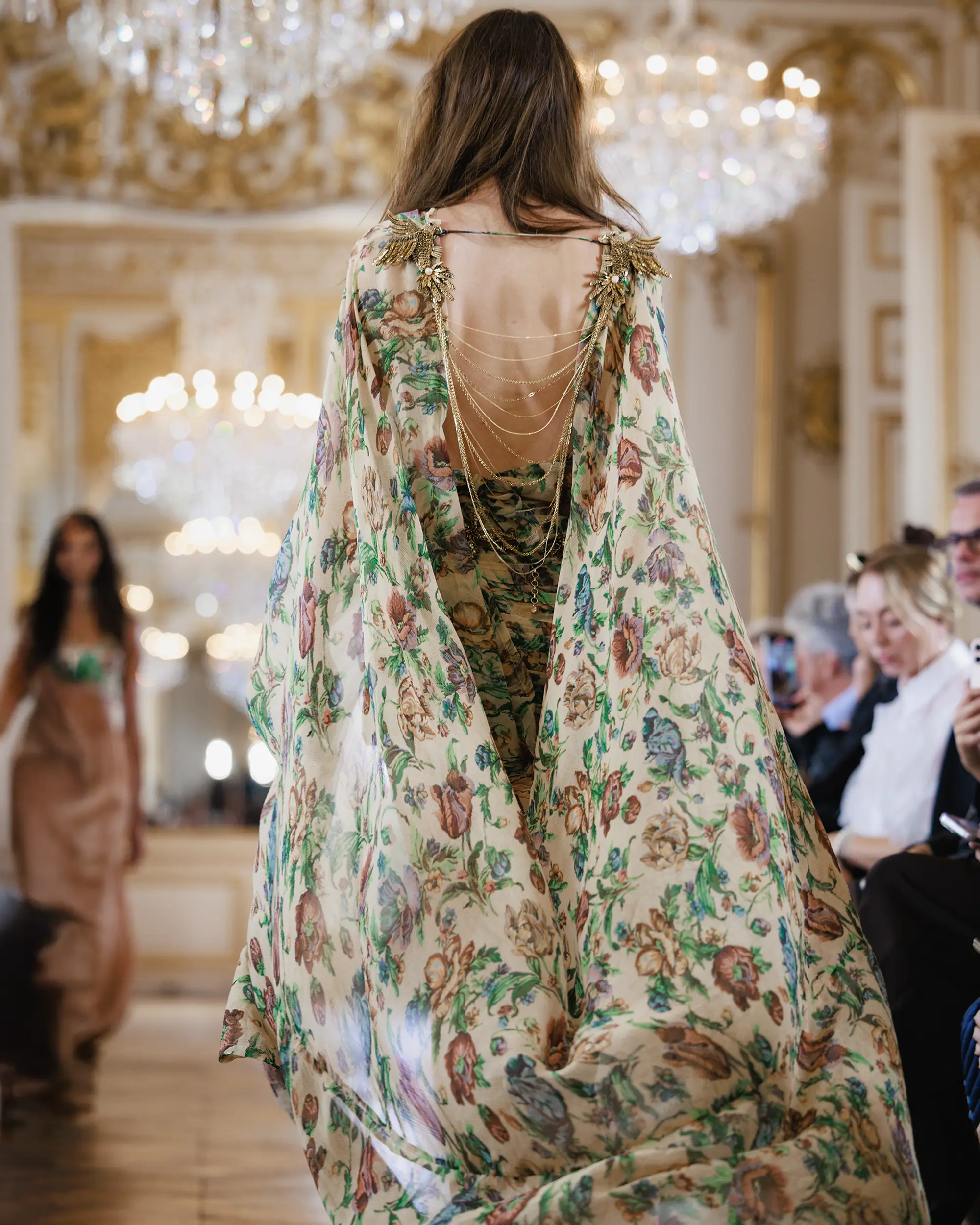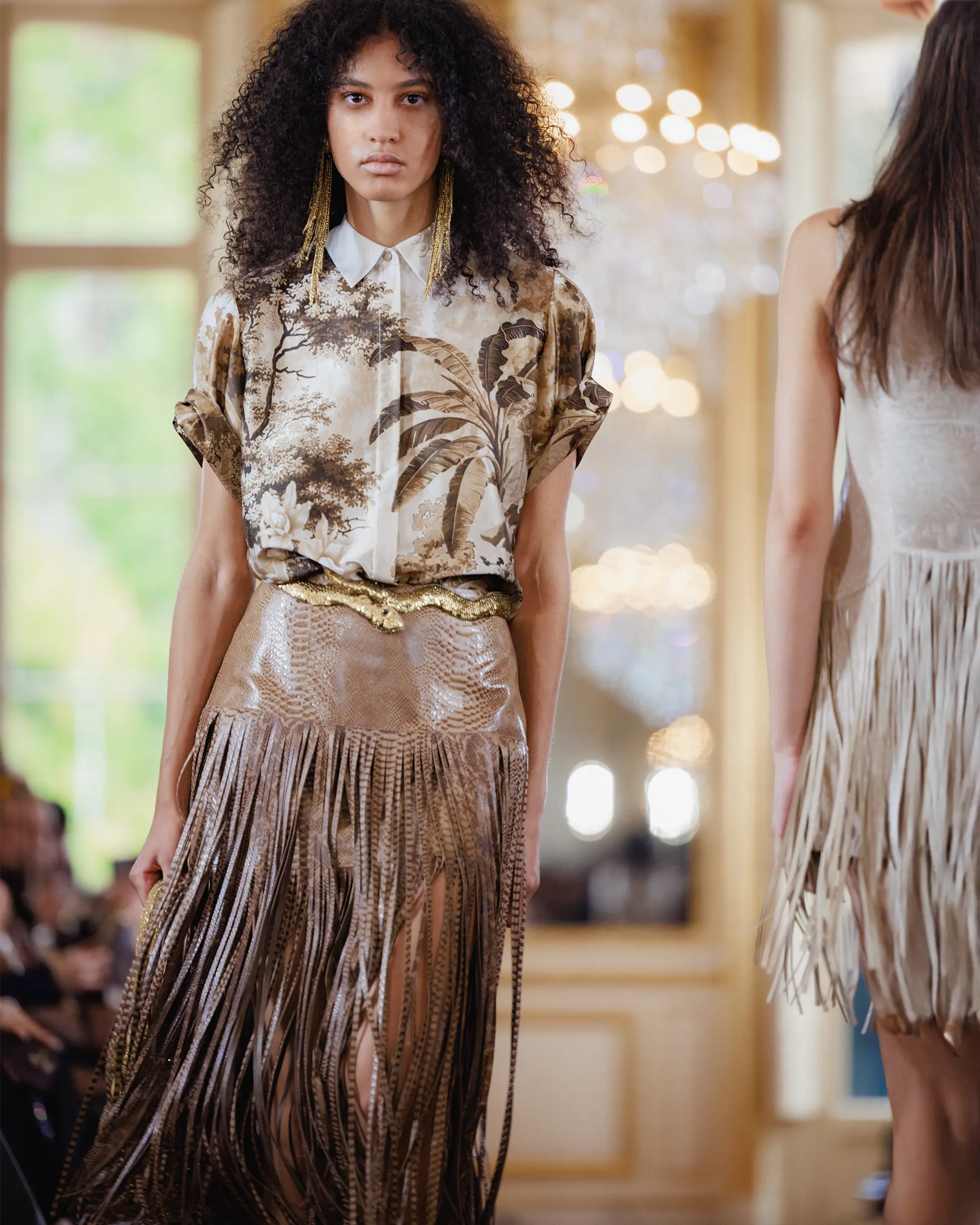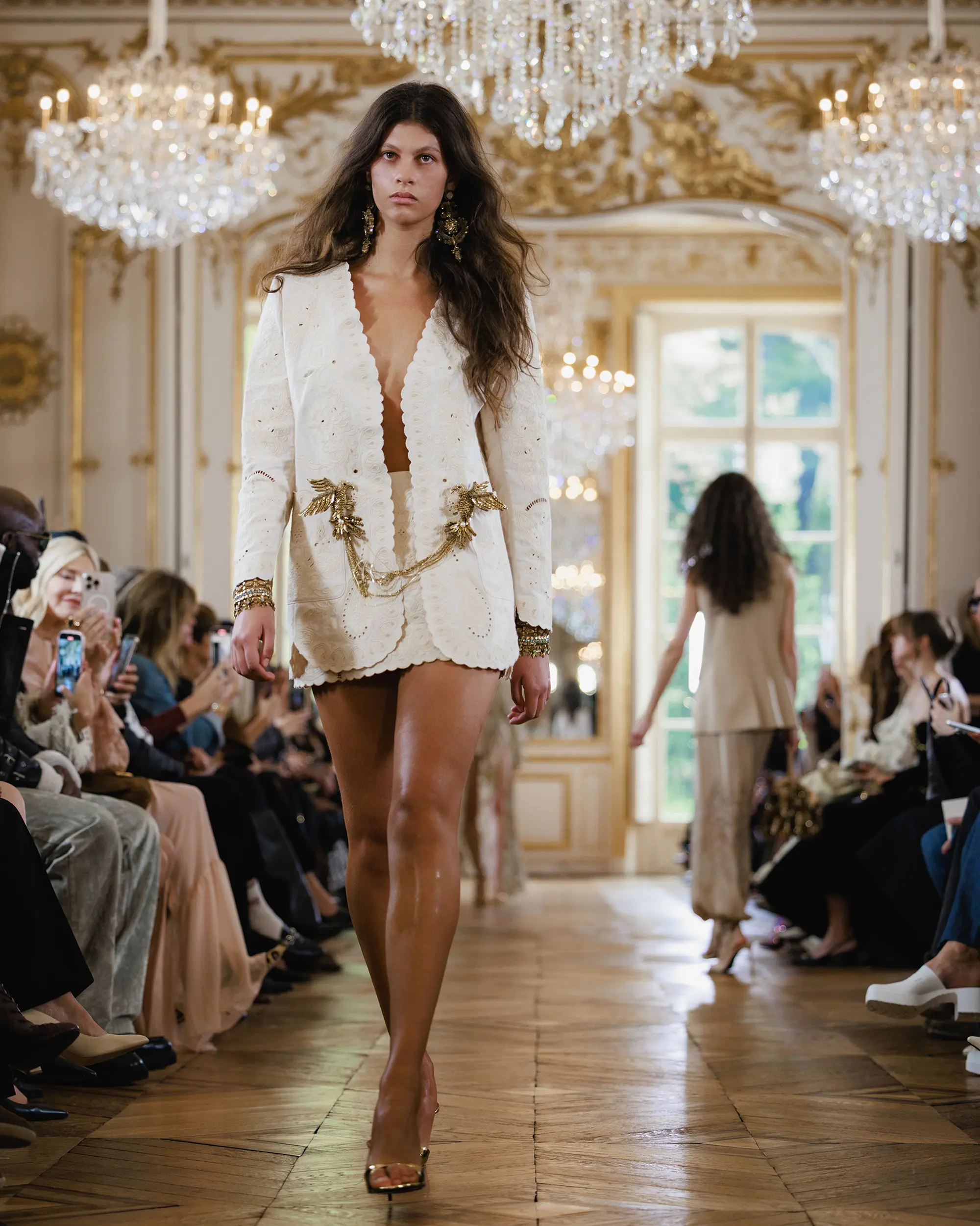 配饰则进一步强化了这一蜕变的主题。蛇形皮带与金色盘绕式珠宝仿佛象征着重生与自我觉醒;雕塑感的皇冠式头饰亦呼应主题——将波希风格升华为现代而大胆的宣言。与 Maison Ernest Paris 在鞋履上的合作、以及与 Deepa Gurnani 在珠宝上的合作,皆彰显 Halperin 对工艺的追求,精准诠释他所坚持的“智慧奢华”:欧洲格调、手工织物与匠心装饰,以现代且易于接触的方式呈现。