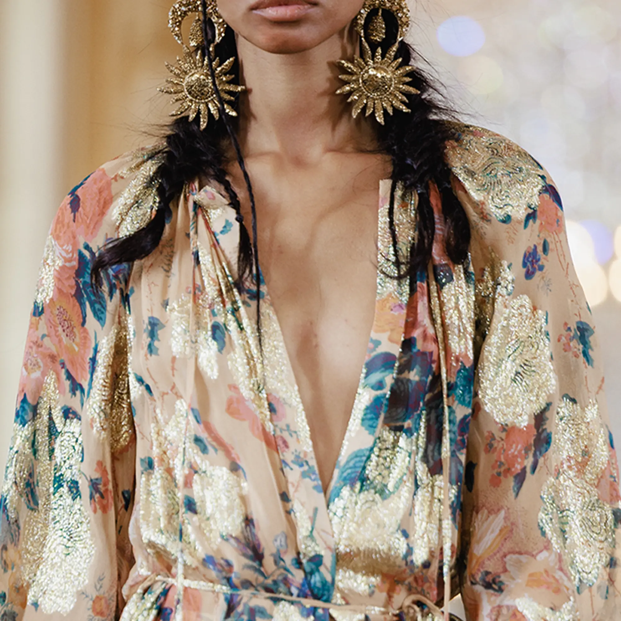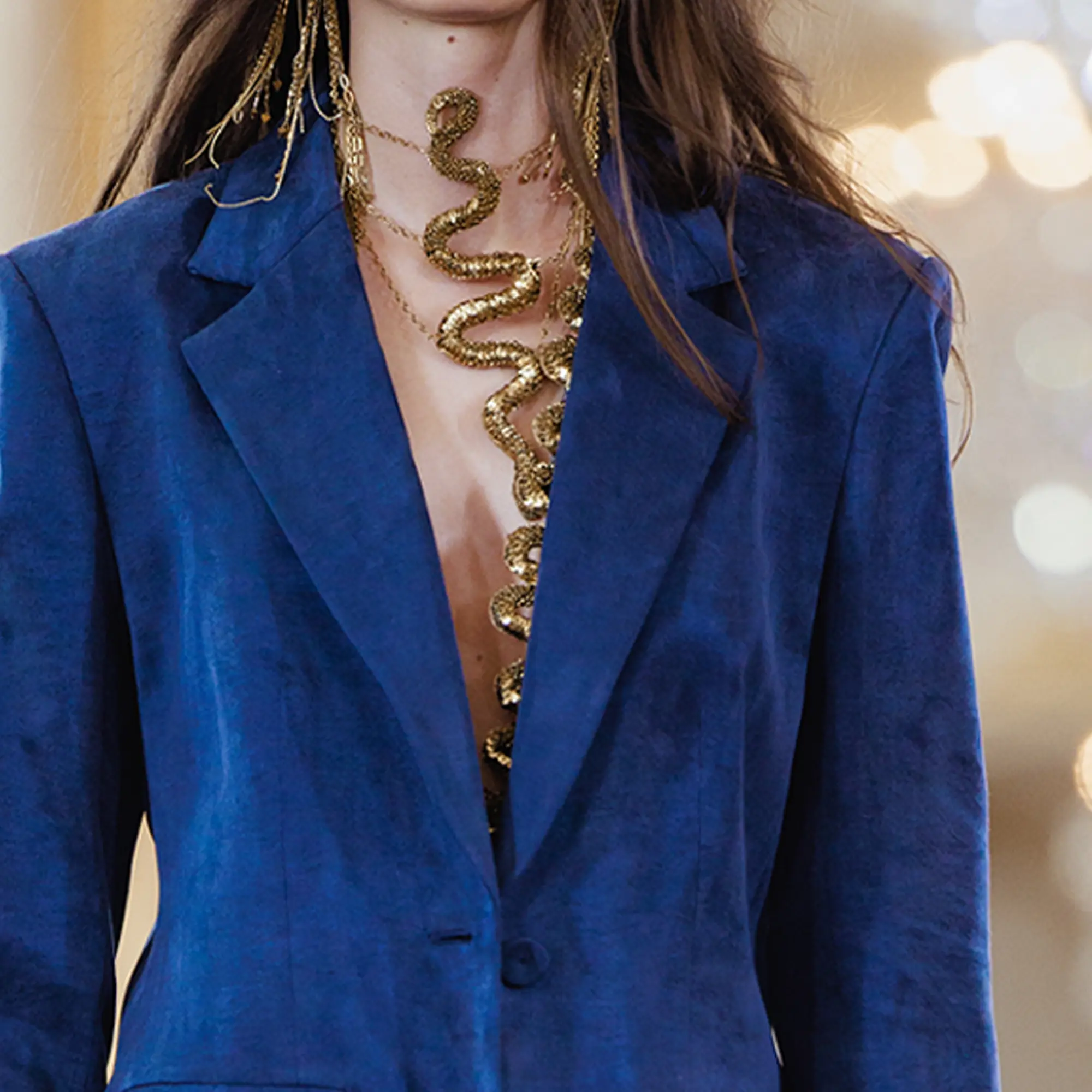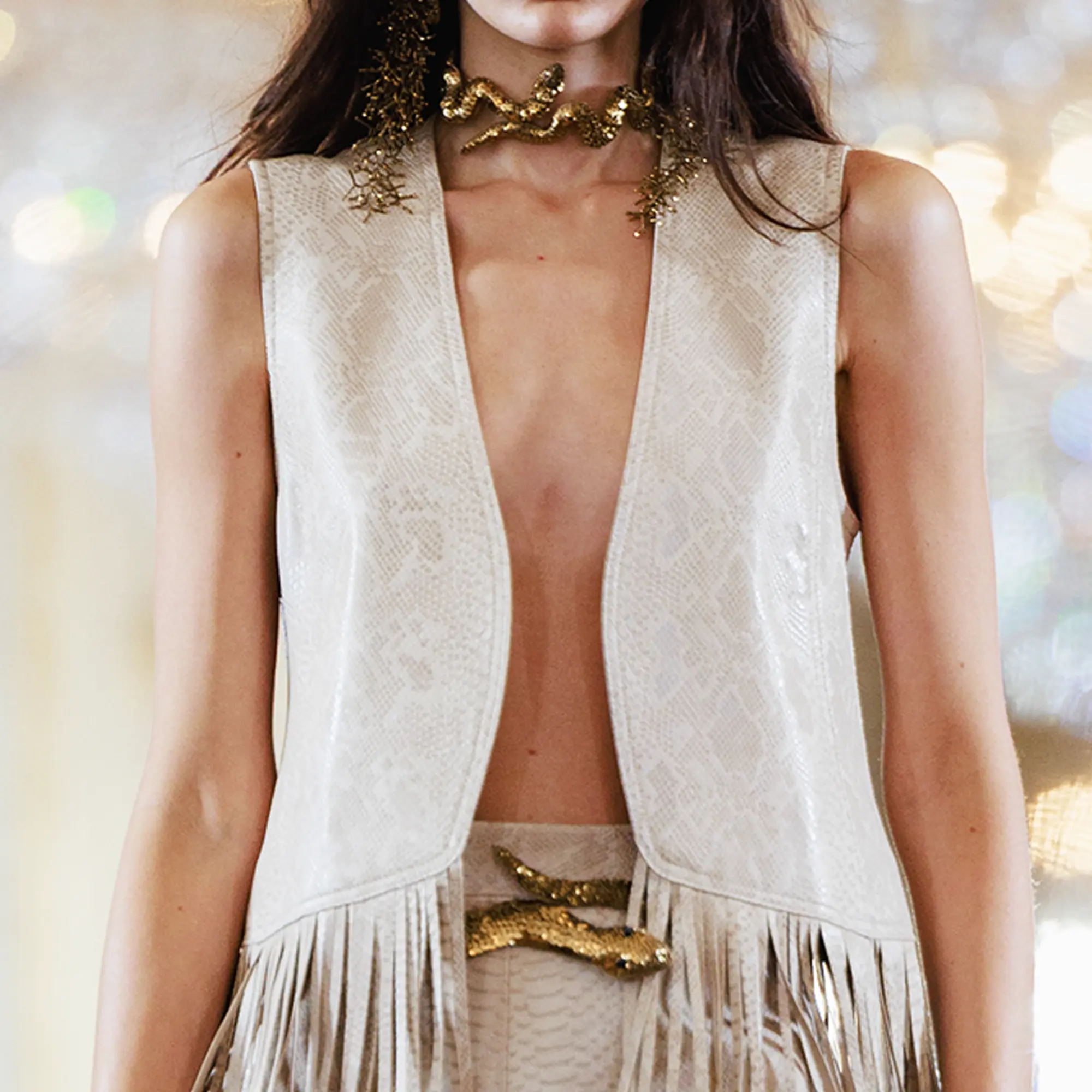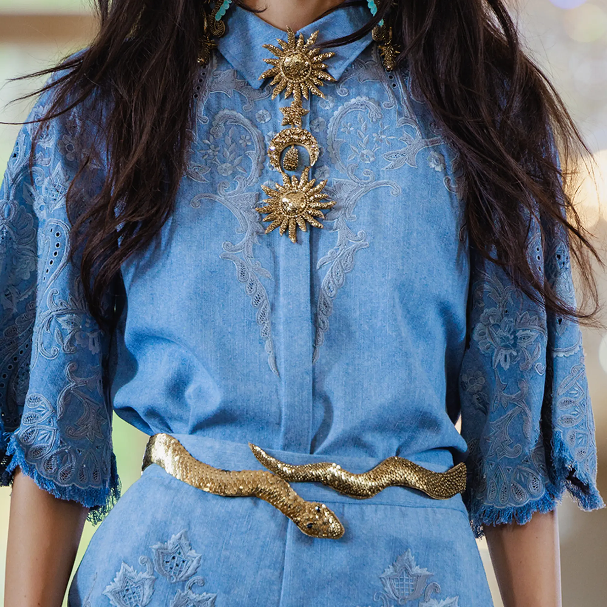 配饰则进一步强化了这一蜕变的主题。蛇形皮带与金色盘绕式珠宝仿佛象征着重生与自我觉醒;雕塑感的皇冠式头饰亦呼应主题——将波希风格升华为现代而大胆的宣言。与 Maison Ernest Paris 在鞋履上的合作、以及与 Deepa Gurnani 在珠宝上的合作,皆彰显 Halperin 对工艺的追求,精准诠释他所坚持的“智慧奢华”:欧洲格调、手工织物与匠心装饰,以现代且易于接触的方式呈现。