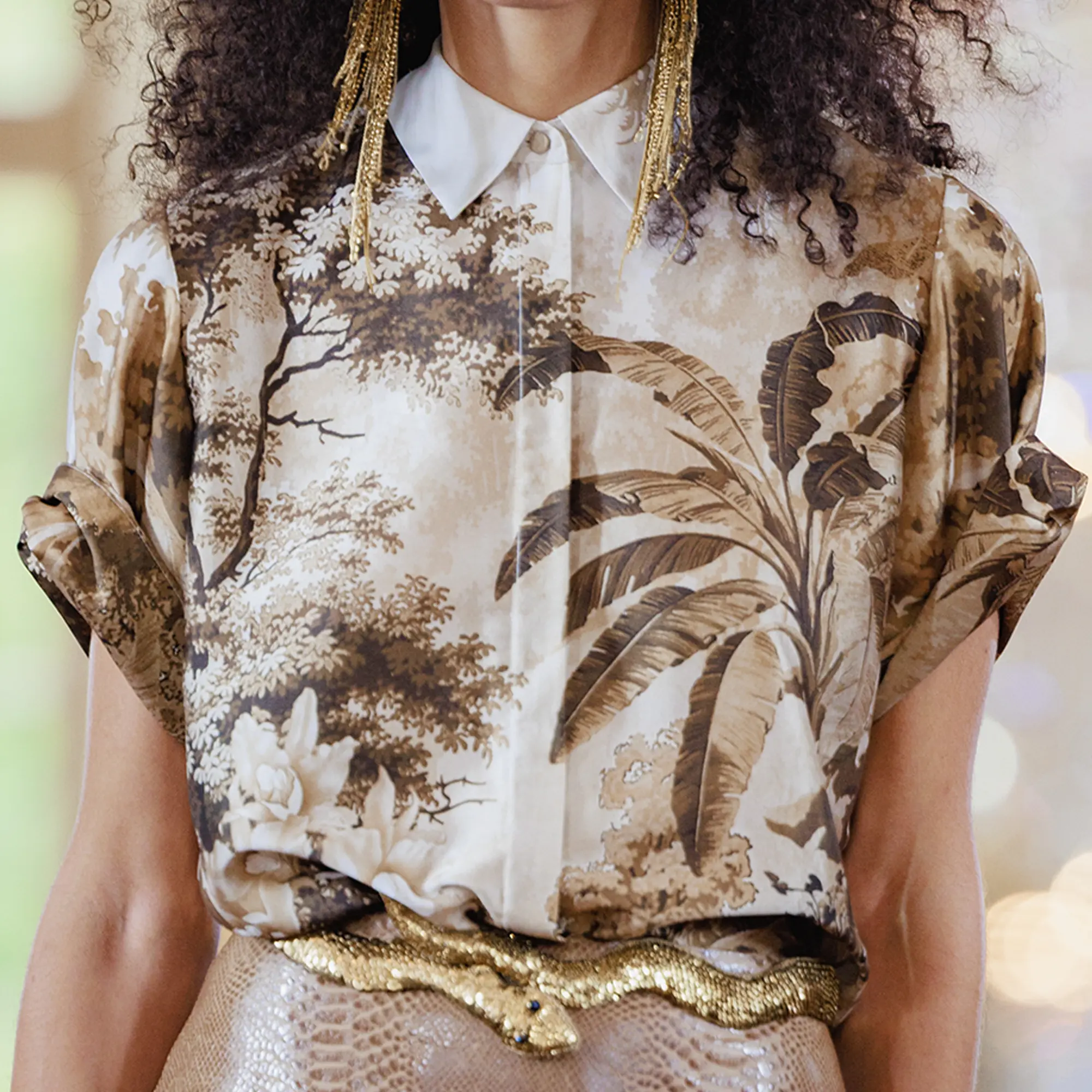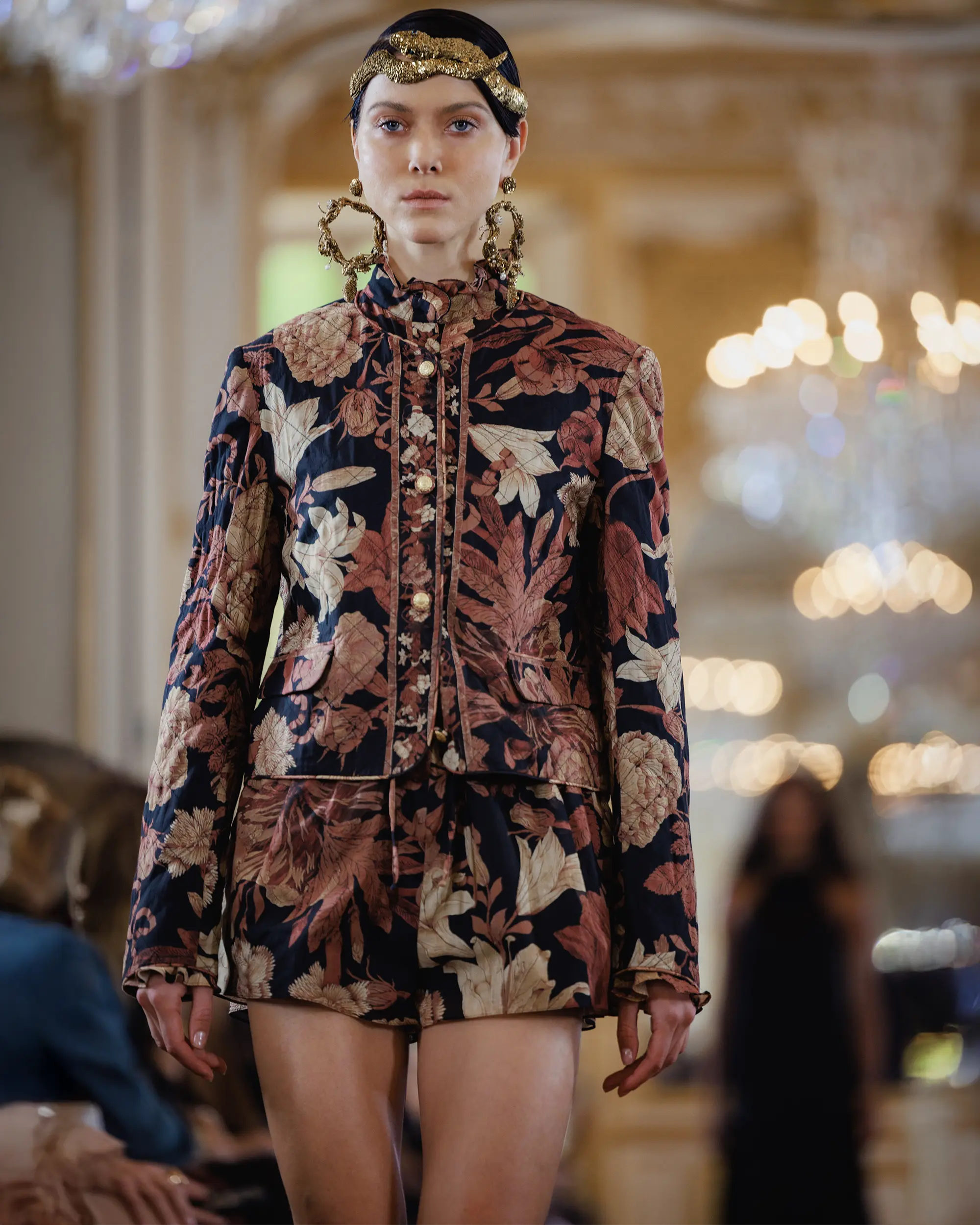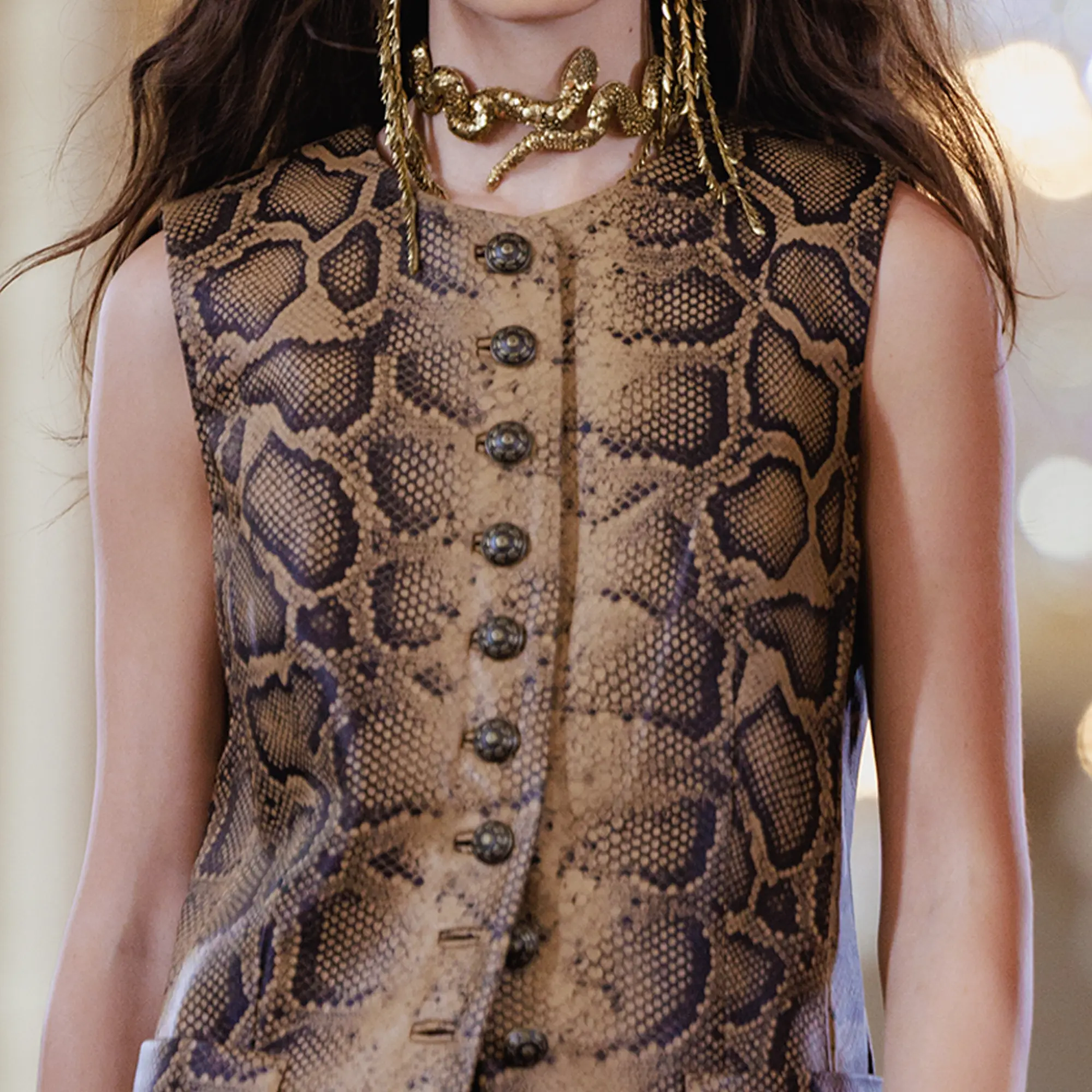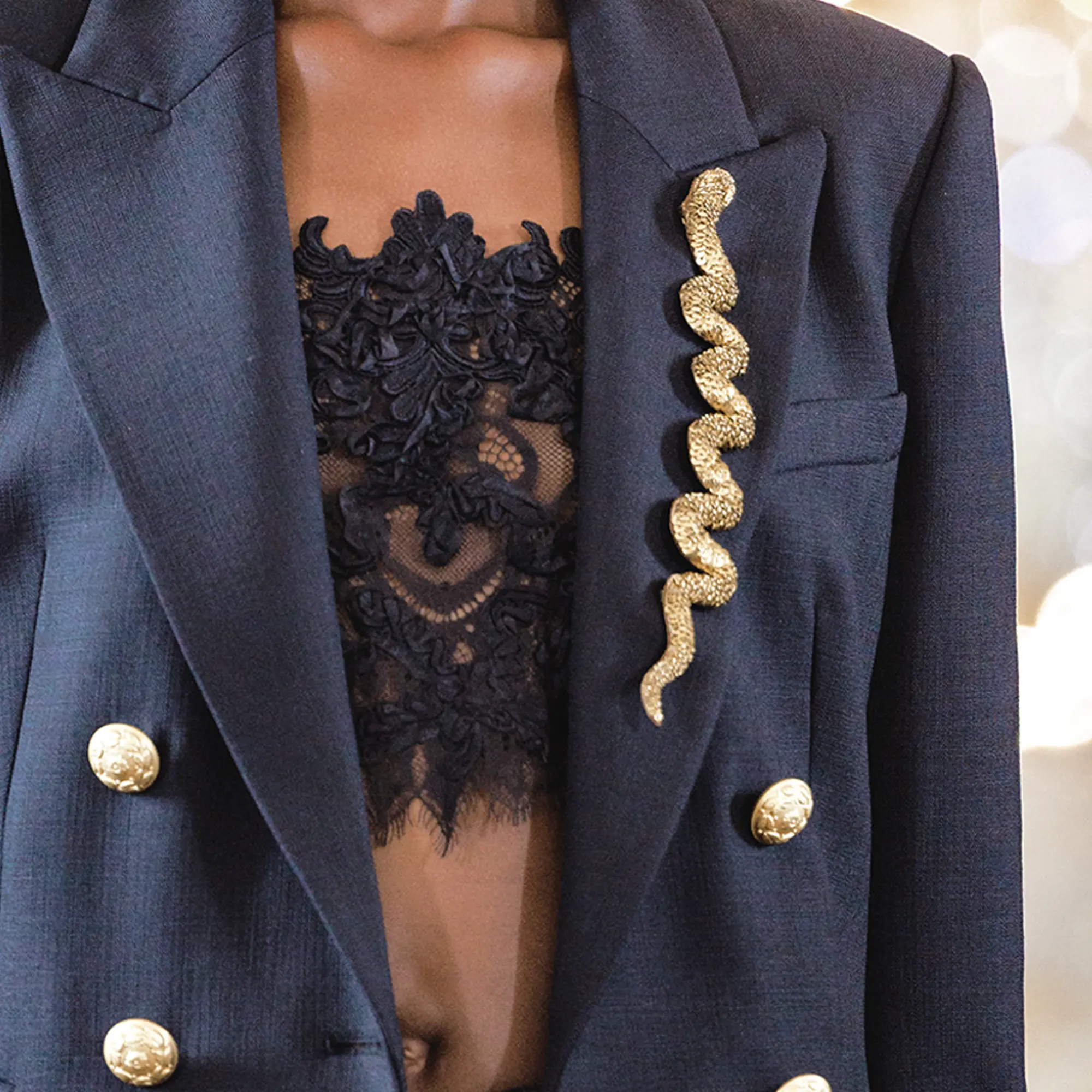 配饰则进一步强化了这一蜕变的主题。蛇形皮带与金色盘绕式珠宝仿佛象征着重生与自我觉醒;雕塑感的皇冠式头饰亦呼应主题——将波希风格升华为现代而大胆的宣言。与 Maison Ernest Paris 在鞋履上的合作、以及与 Deepa Gurnani 在珠宝上的合作,皆彰显 Halperin 对工艺的追求,精准诠释他所坚持的“智慧奢华”:欧洲格调、手工织物与匠心装饰,以现代且易于接触的方式呈现。