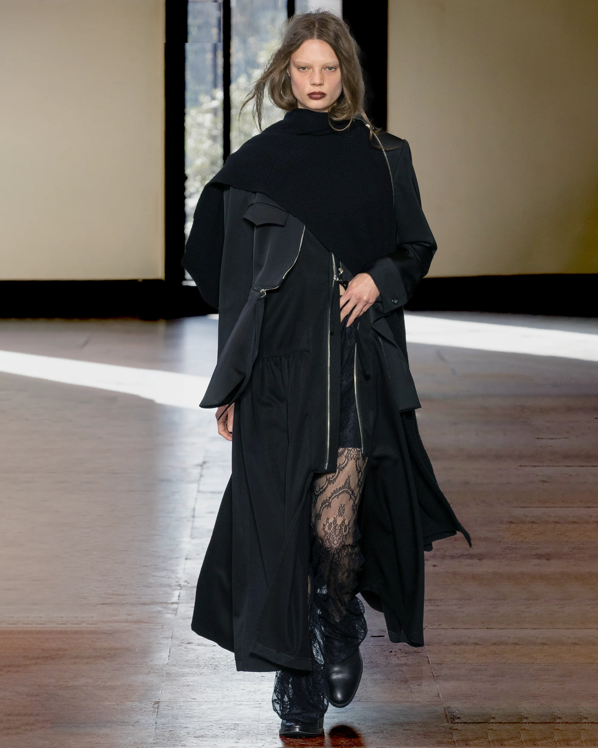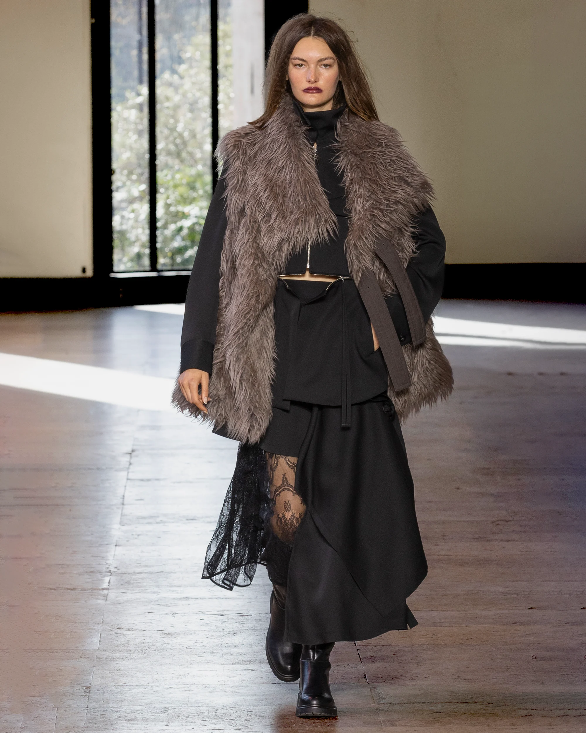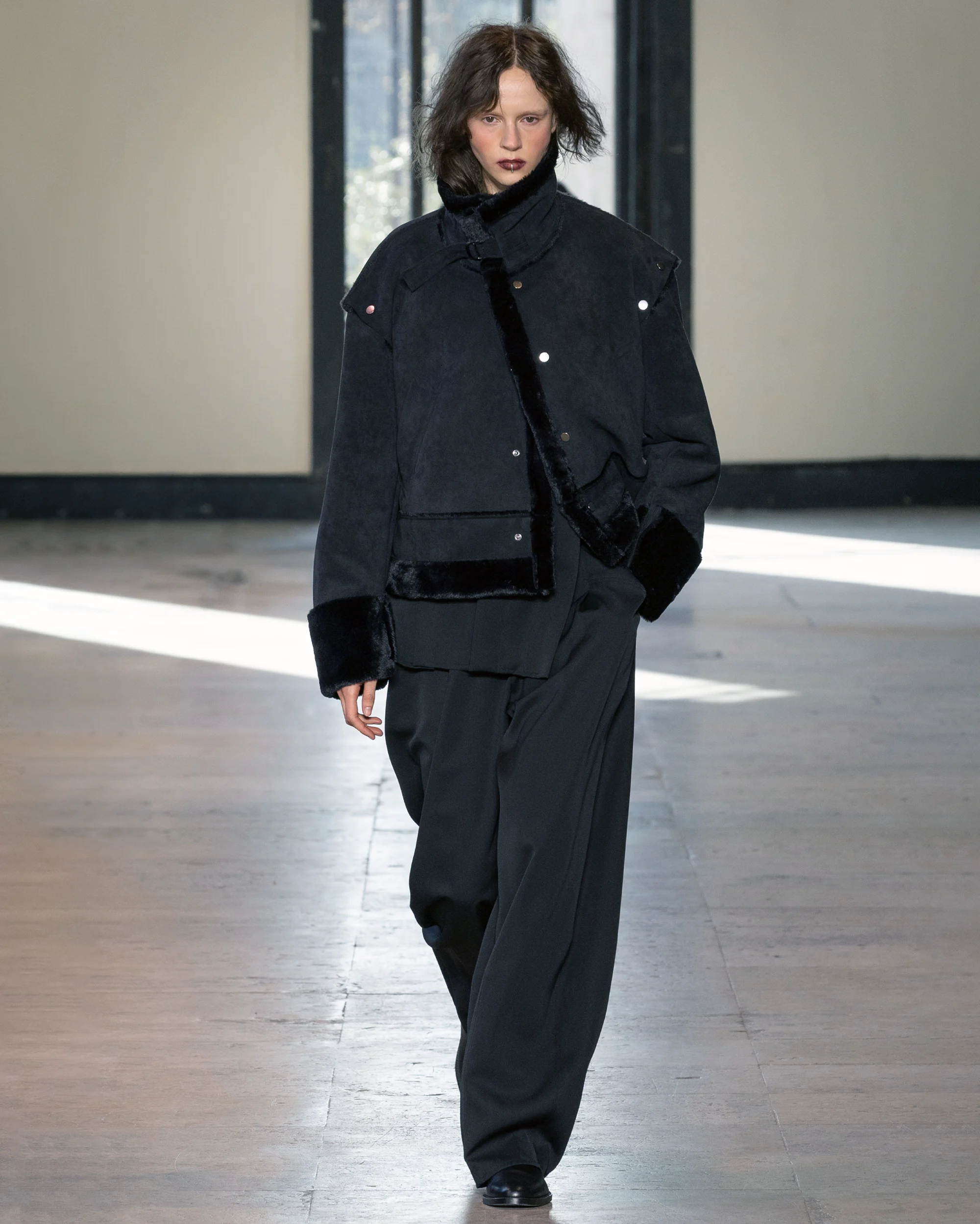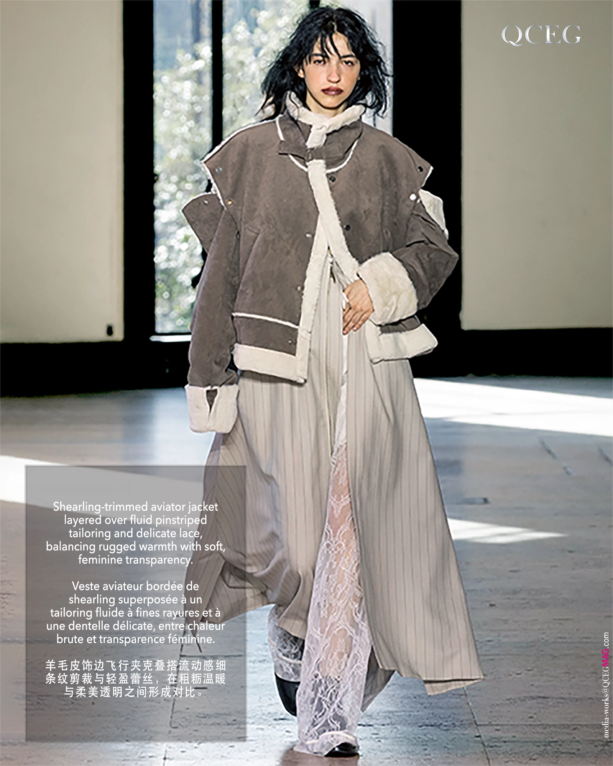 UJOH FW26/27 秀场亦探索出人意料的组合。仿麂皮与人造皮草被运用于飞行夹克之上,蕾丝则出现在非常规位置。拉链作为结构元素贯穿服装,切割出棱角分明、略带粗粝感的轮廓,塑造出鲜明的视觉识别。