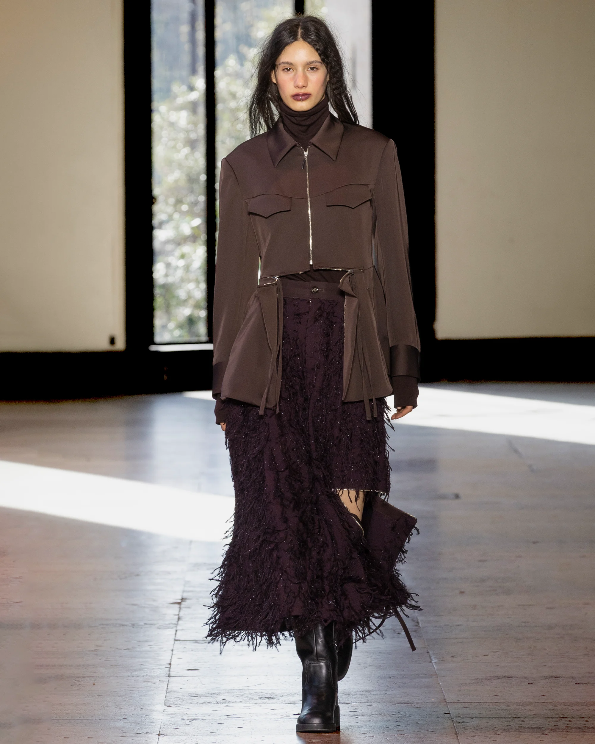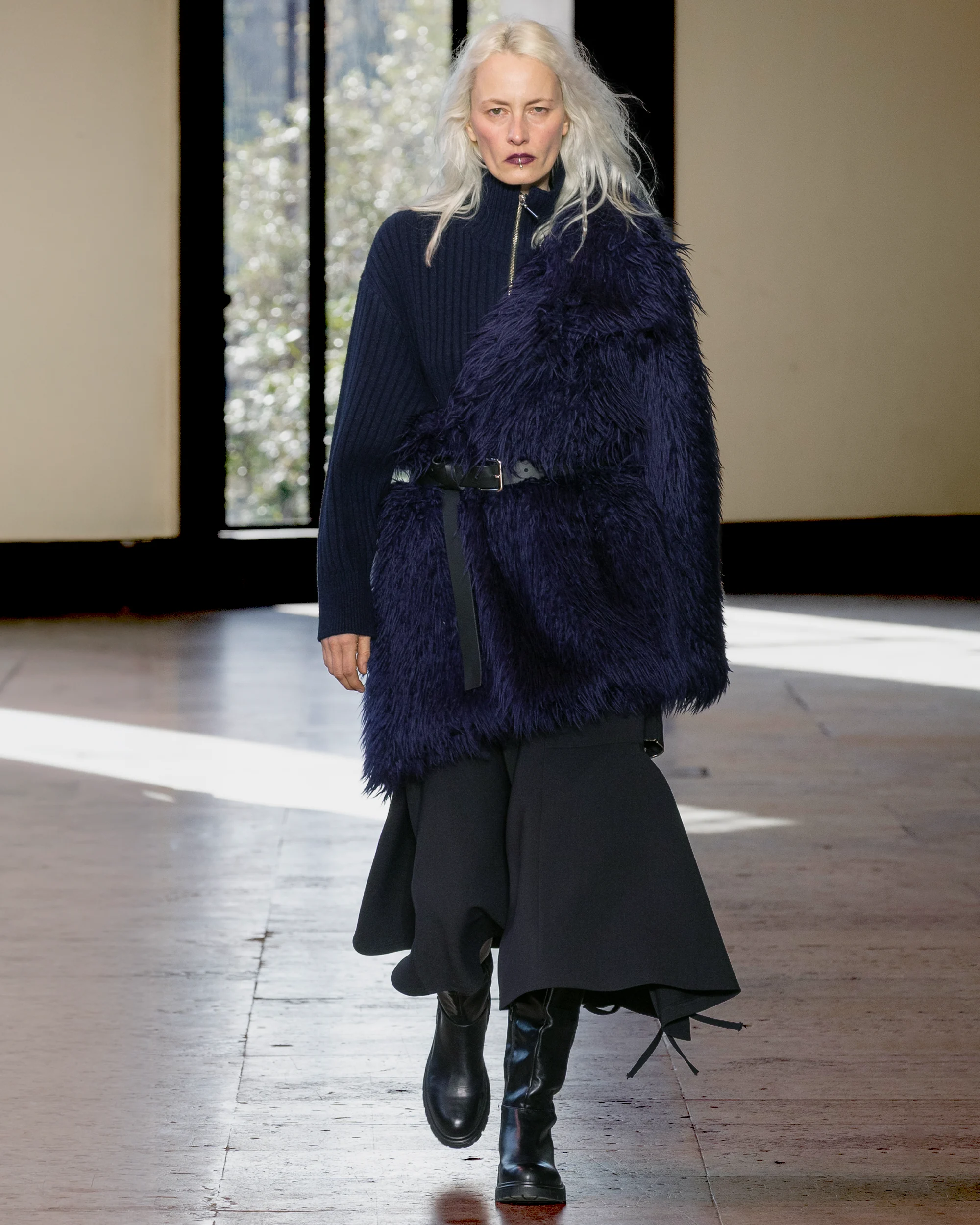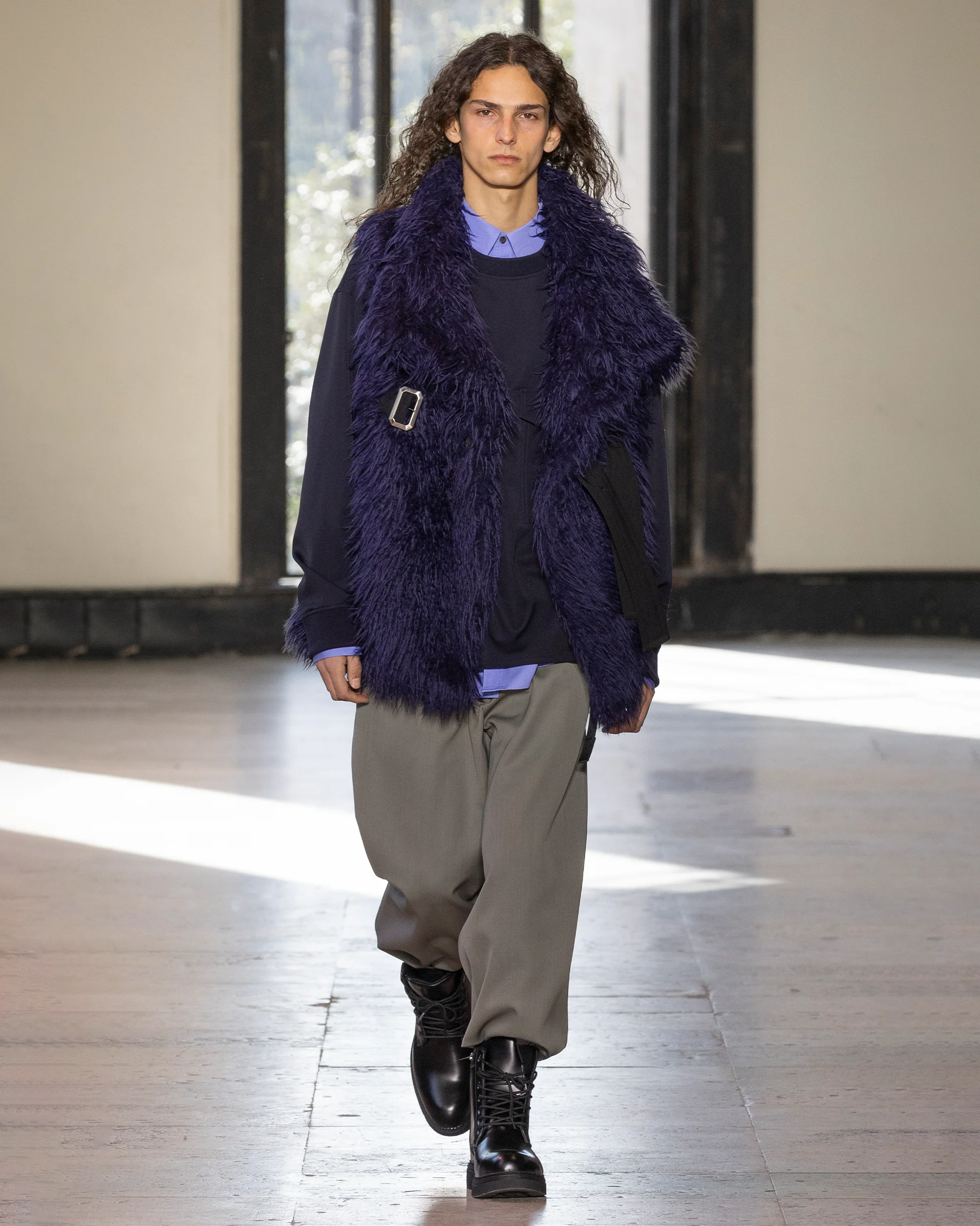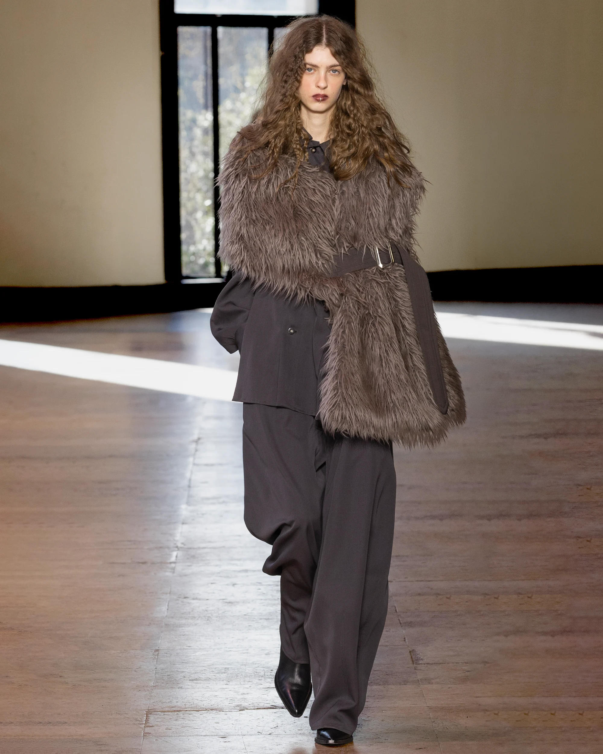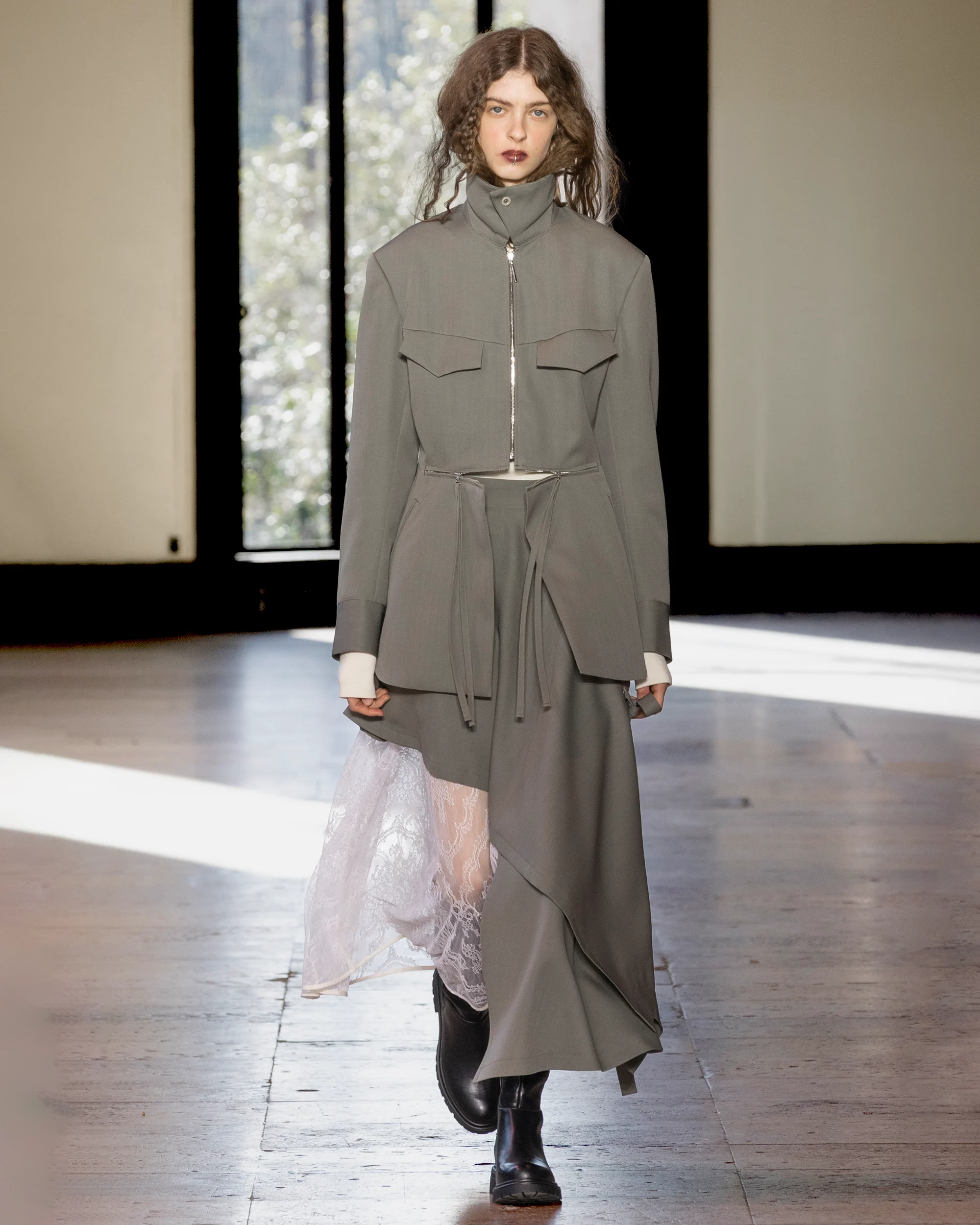 UJOH FW26/27 秀场亦探索出人意料的组合。仿麂皮与人造皮草被运用于飞行夹克之上,蕾丝则出现在非常规位置。拉链作为结构元素贯穿服装,切割出棱角分明、略带粗粝感的轮廓,塑造出鲜明的视觉识别。