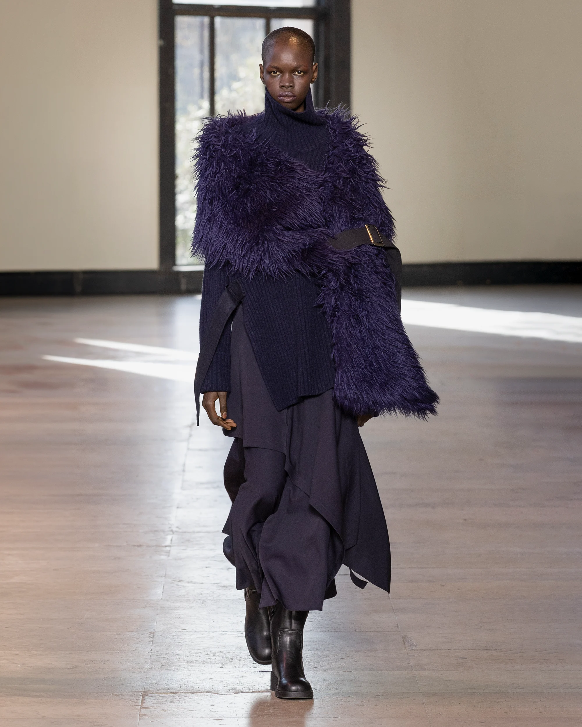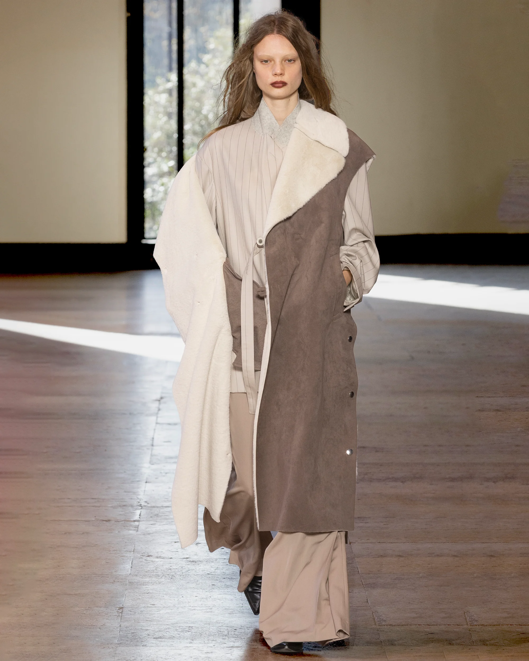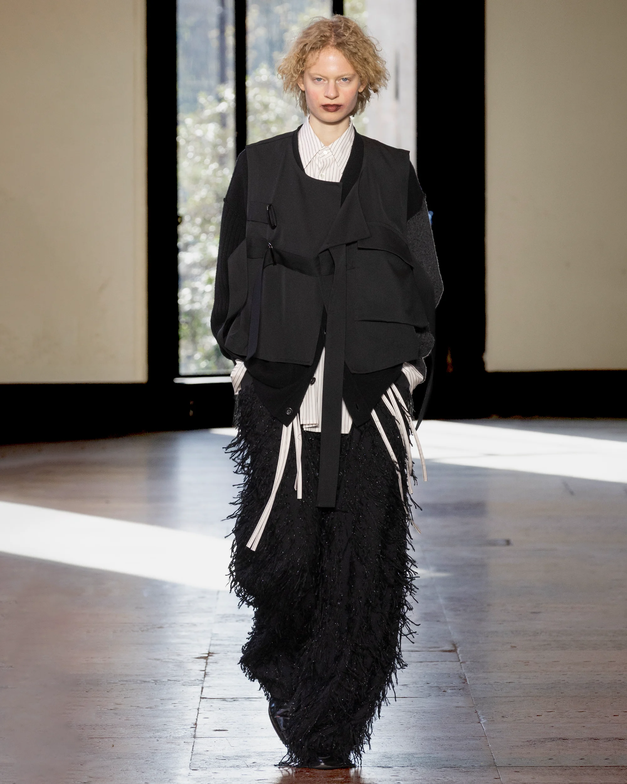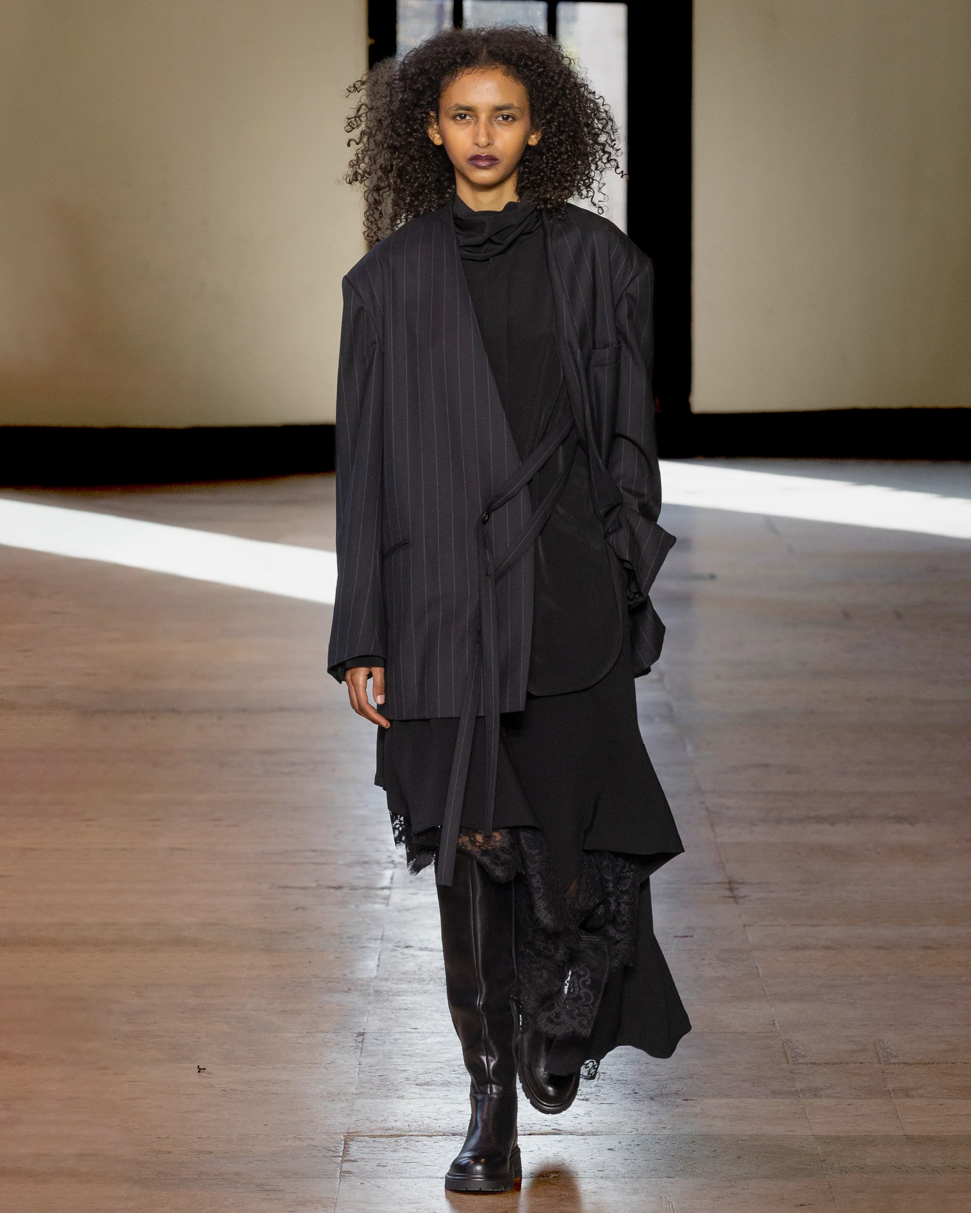 UJOH FW26/27 秀场亦探索出人意料的组合。仿麂皮与人造皮草被运用于飞行夹克之上,蕾丝则出现在非常规位置。拉链作为结构元素贯穿服装,切割出棱角分明、略带粗粝感的轮廓,塑造出鲜明的视觉识别。