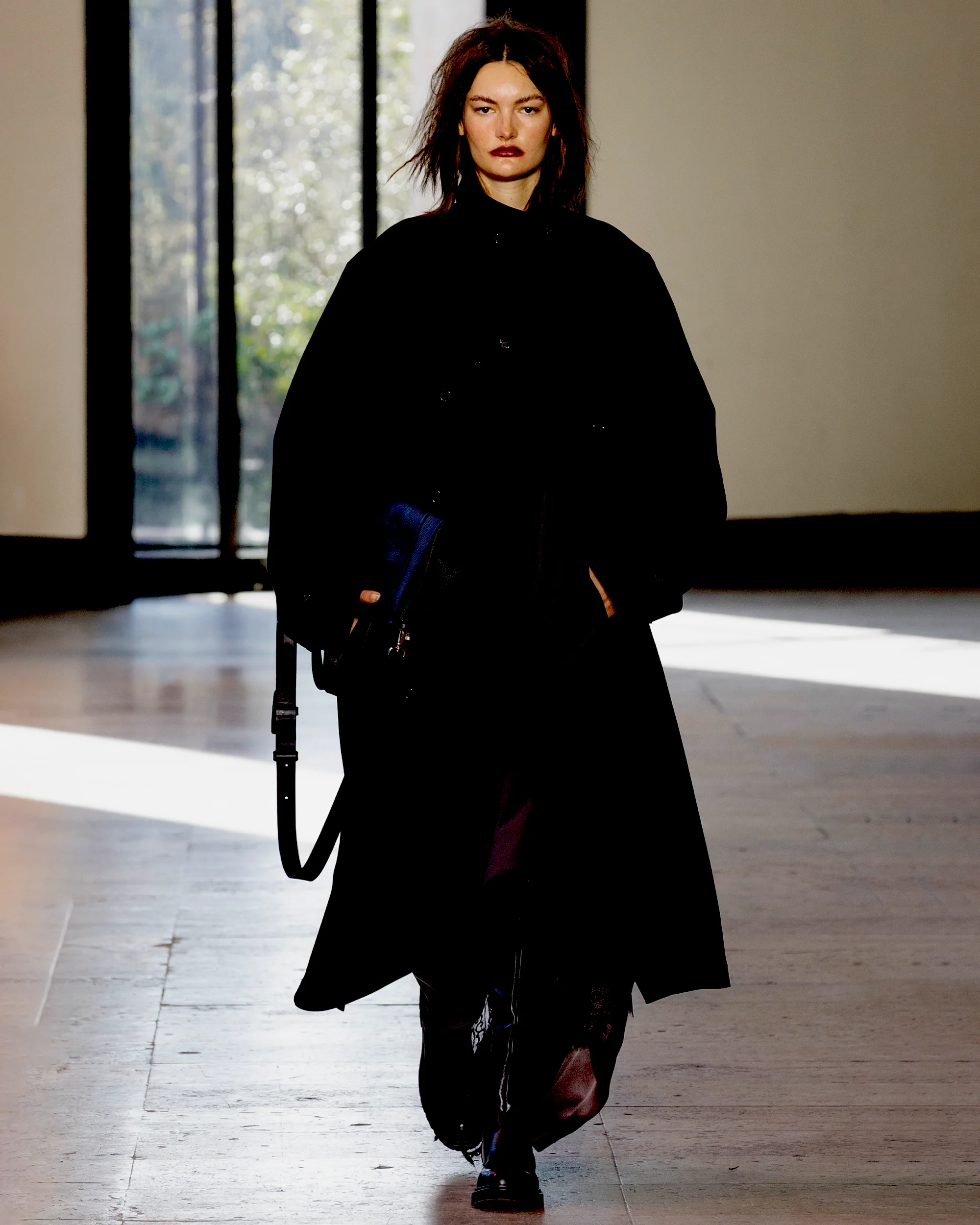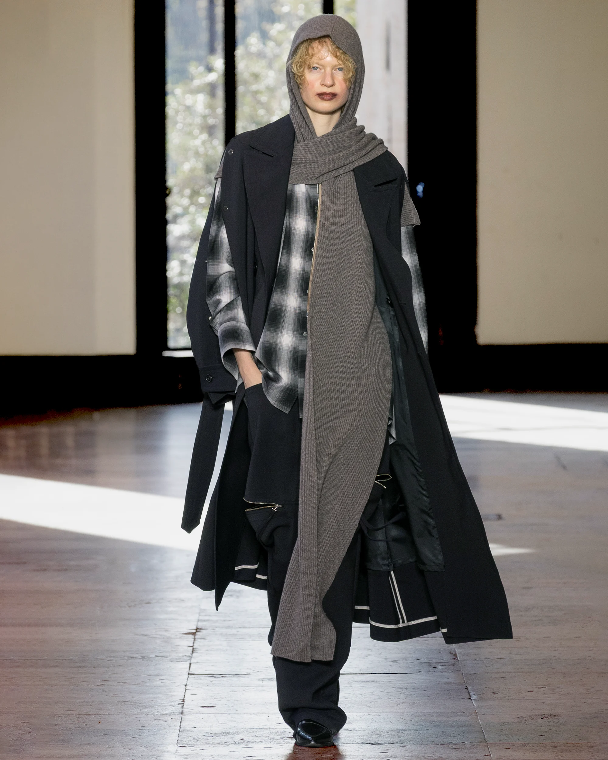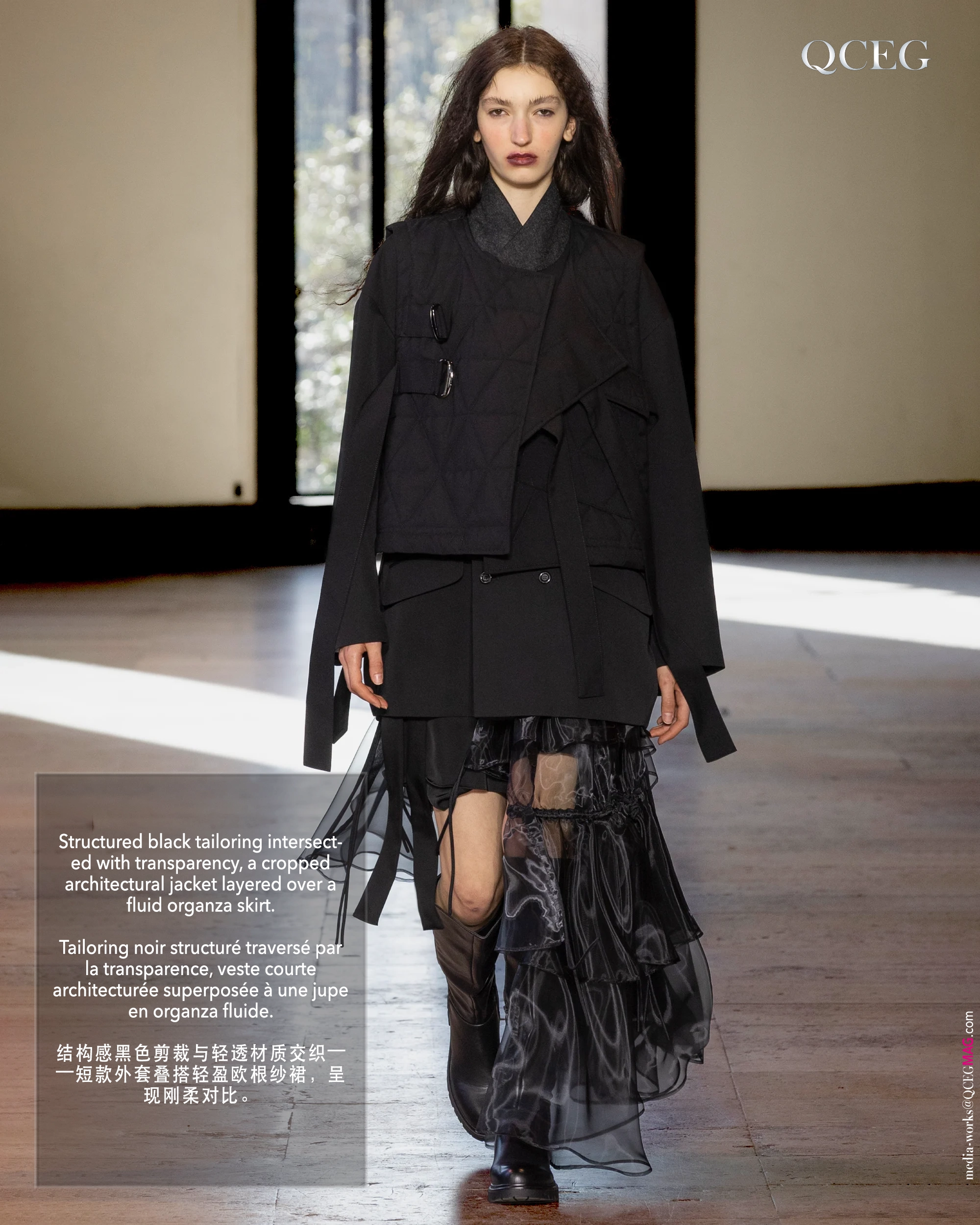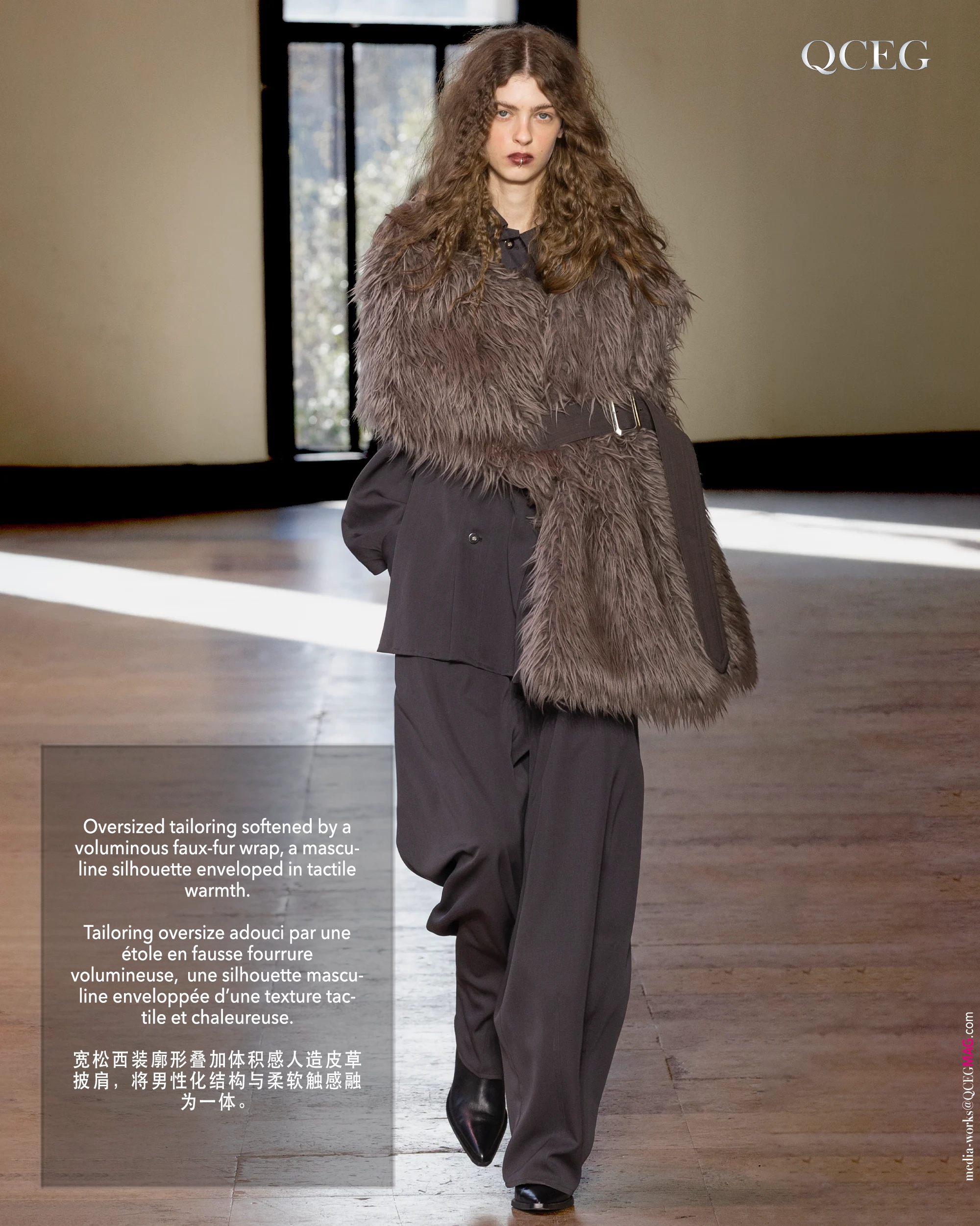 色彩体系进一步强化这种对比。黑色、巧克力色与玫瑰木色为主导,蕨绿色与深无花果色点缀其间,增添层次。“鲨鱼皮”质感的白与米色带来平衡,而格纹元素则 subtly 引入颓废风格。