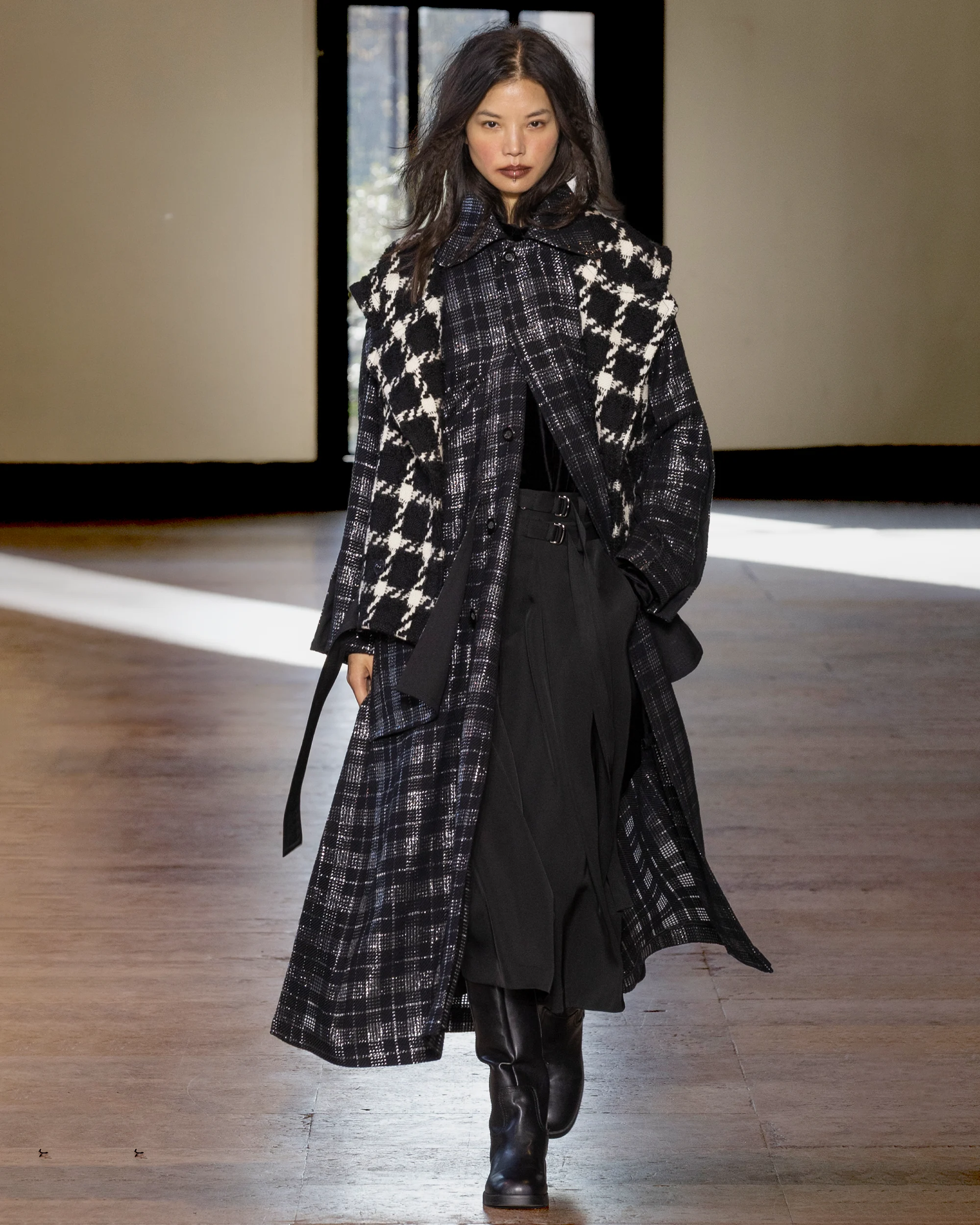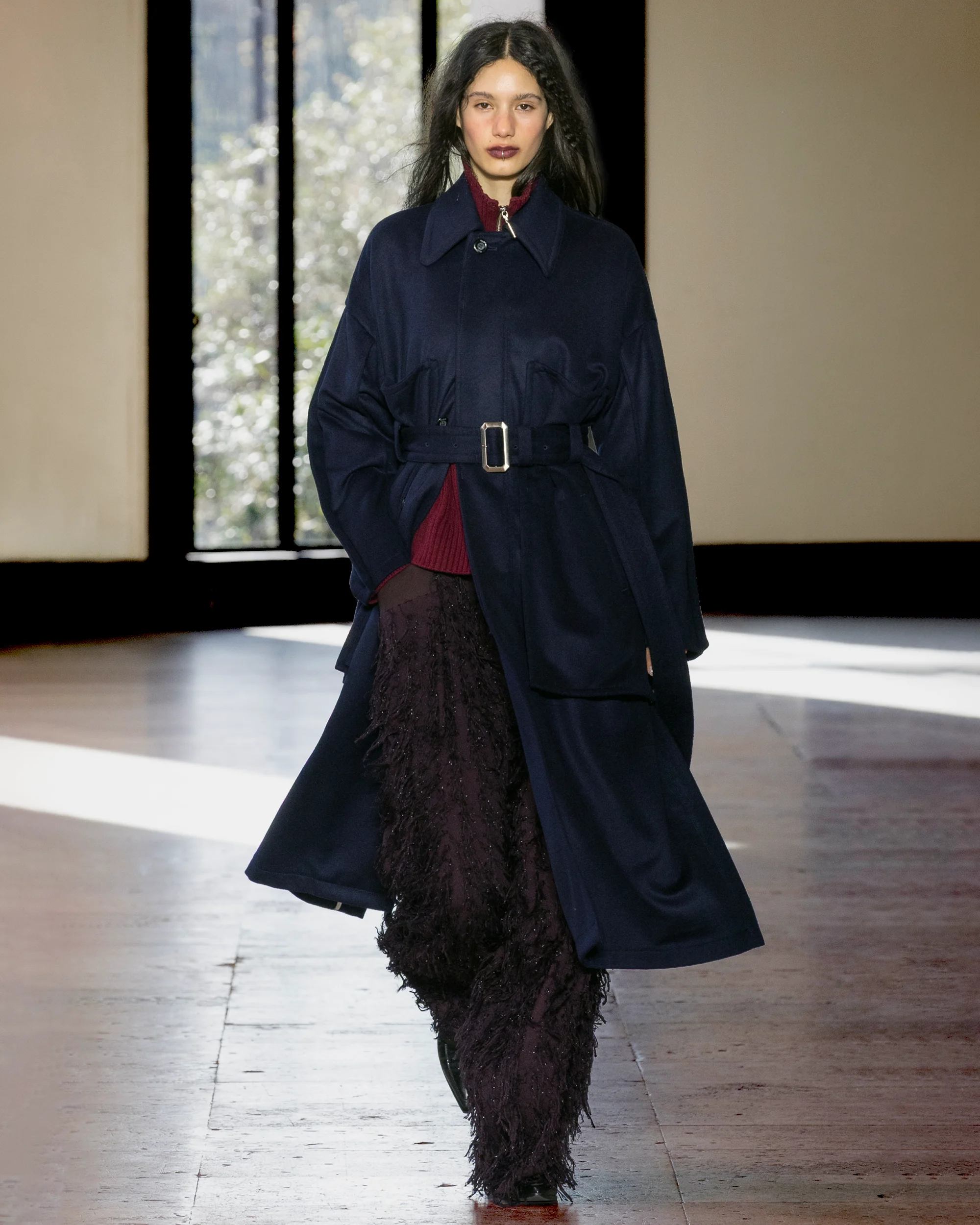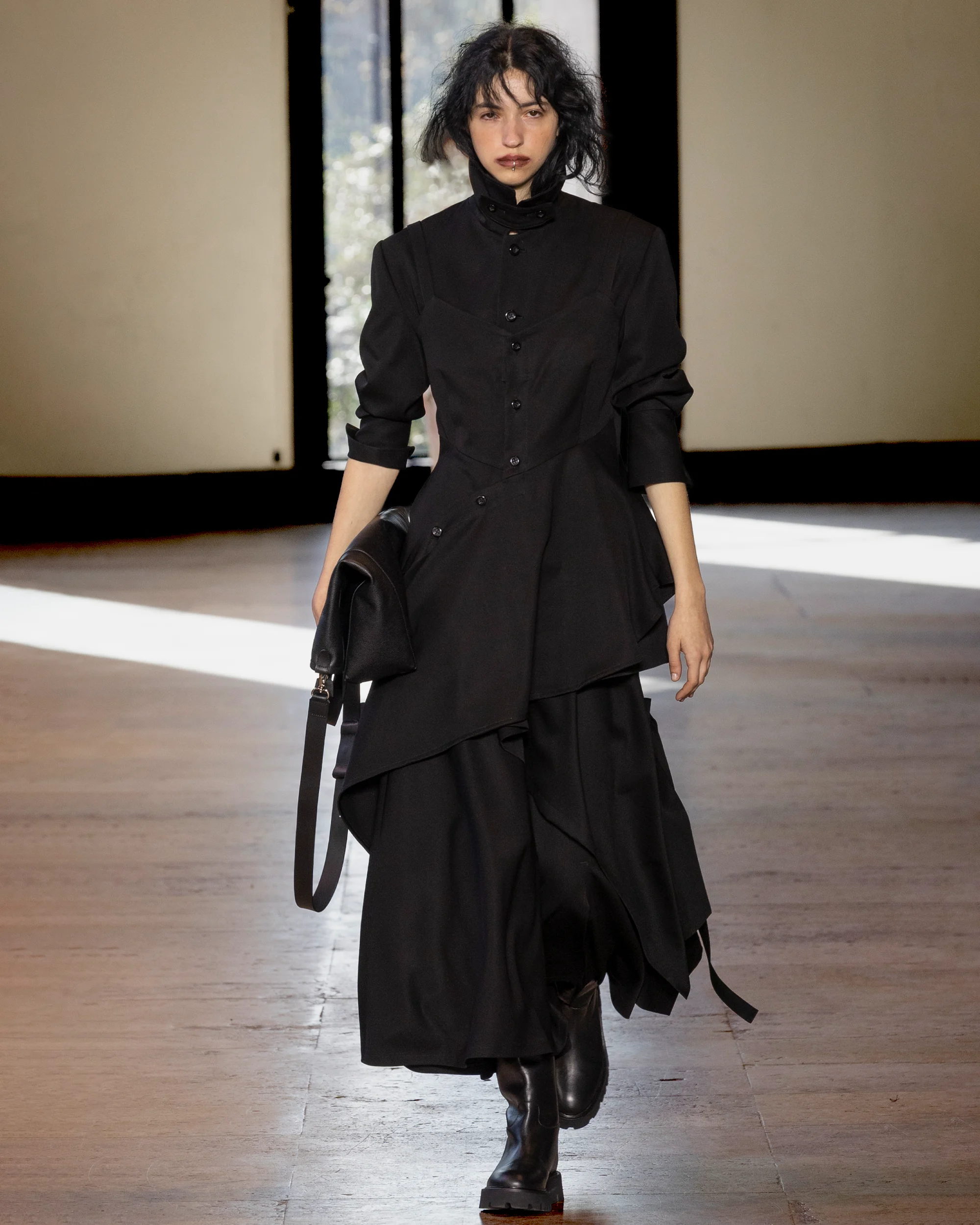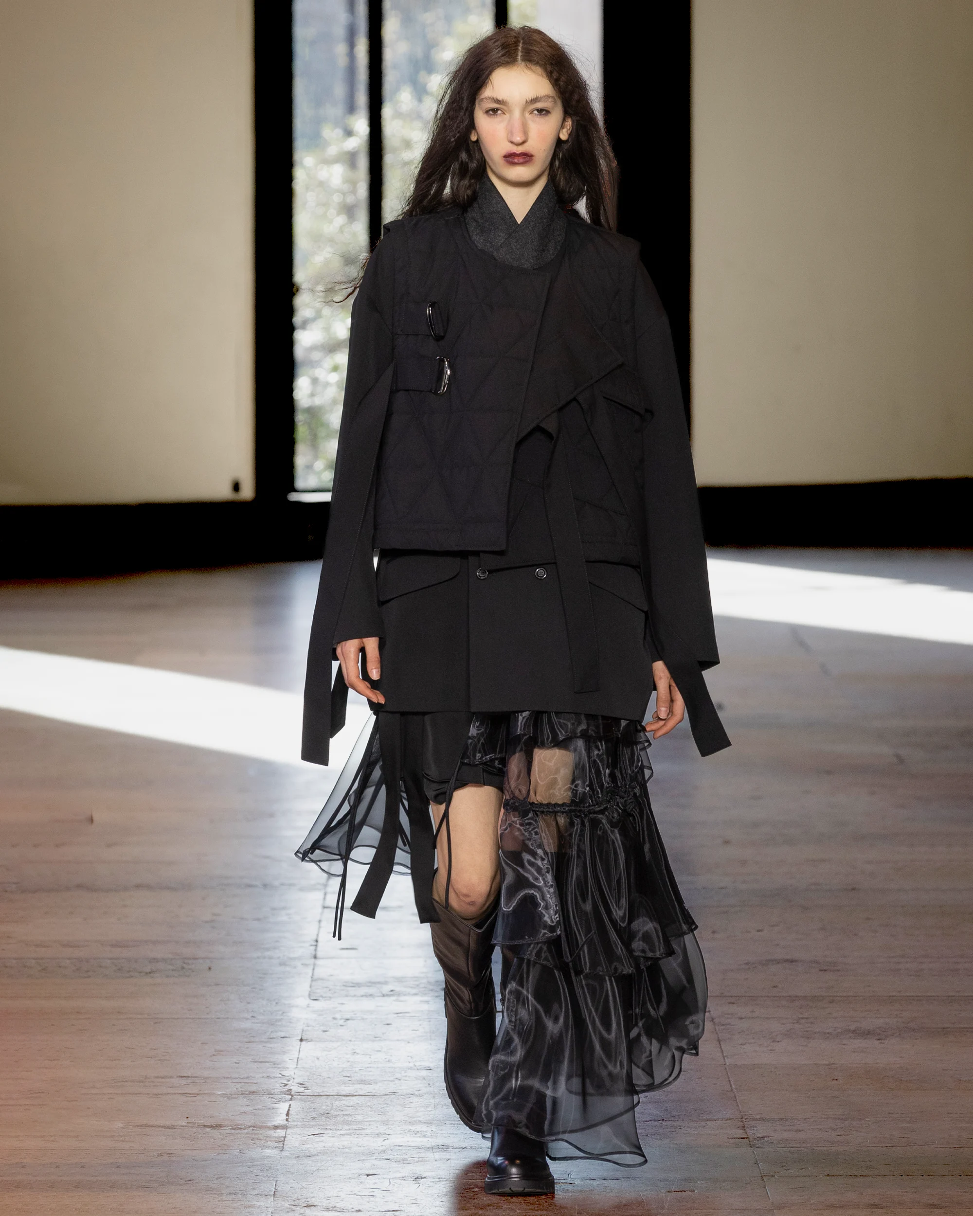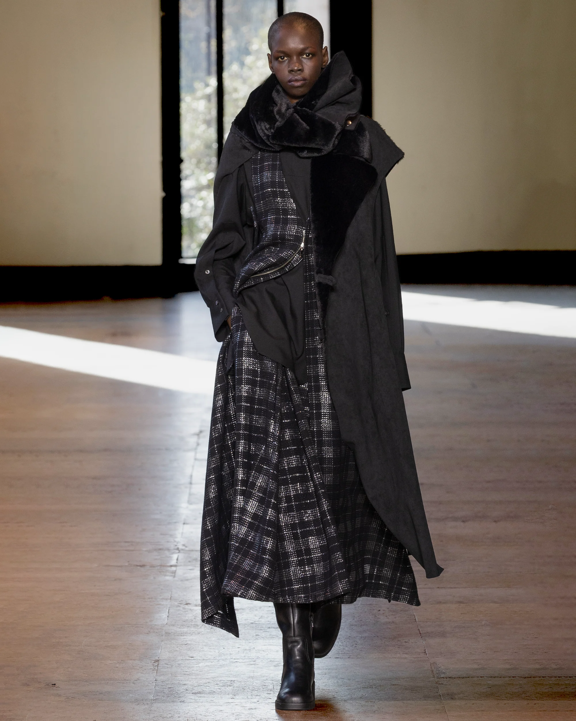 色彩体系进一步强化这种对比。黑色、巧克力色与玫瑰木色为主导,蕨绿色与深无花果色点缀其间,增添层次。“鲨鱼皮”质感的白与米色带来平衡,而格纹元素则 subtly 引入颓废风格。