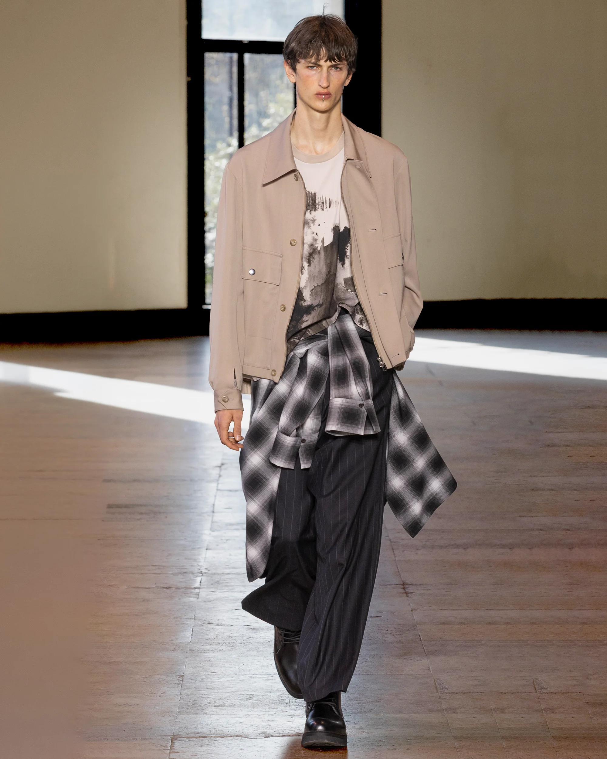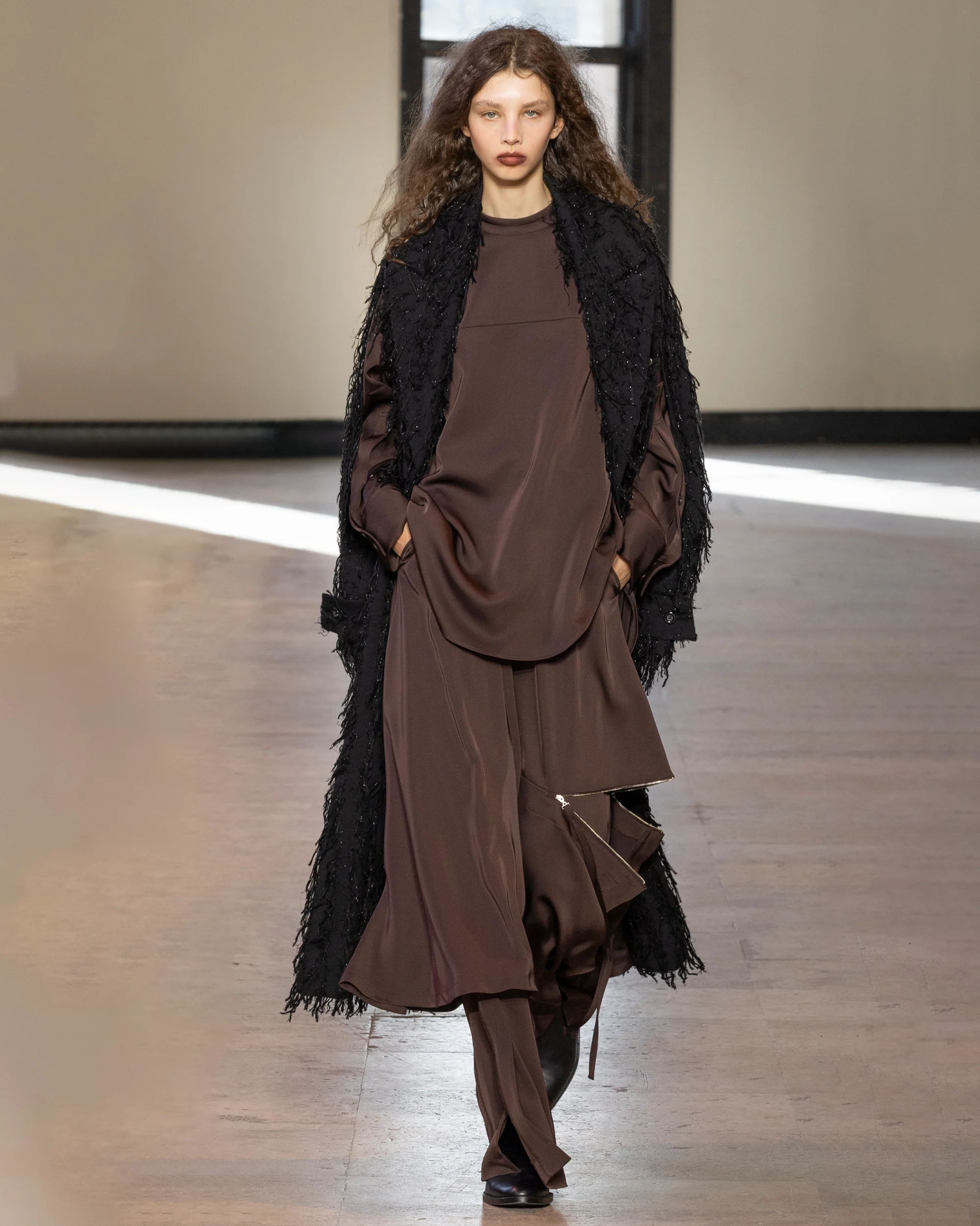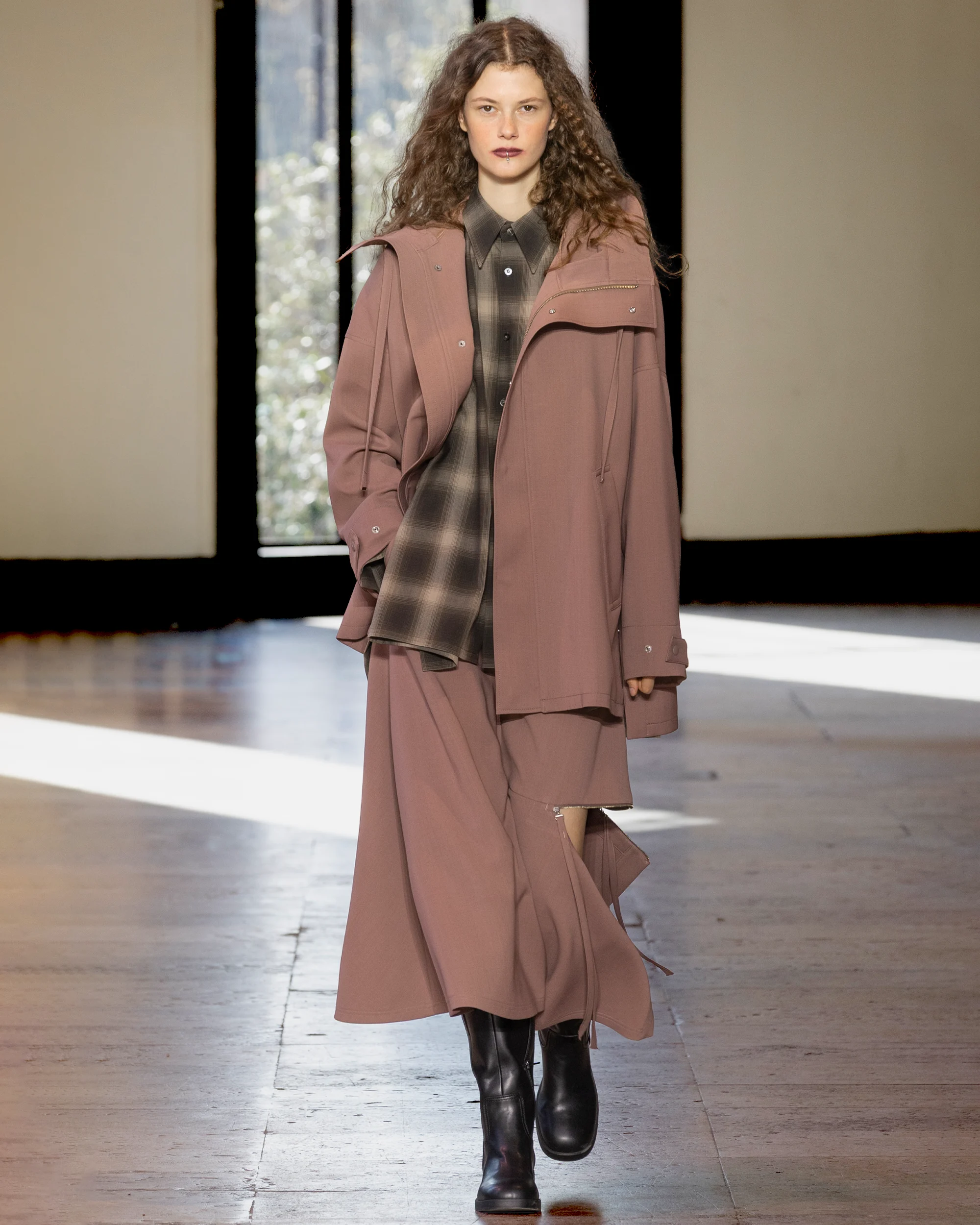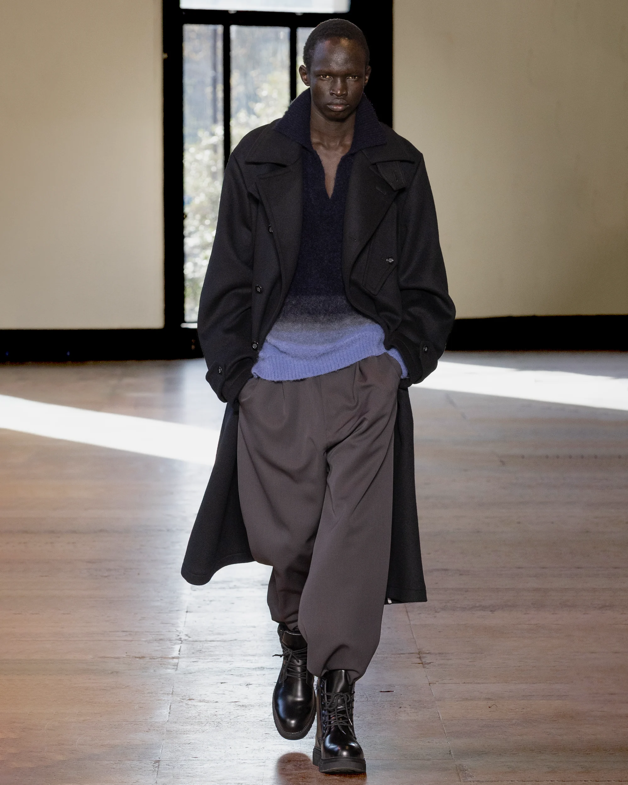 工艺始终是 UJOH 2026–2027 秋冬系列的核心。部分面料于日本采用1960年代的 Schönherr 织机织造,其运行速度远低于现代生产方式,从而增强面料的质感与层次。由此诞生的创新尼龙与轻透材质,既凸显触感,也契合慢时尚理念。