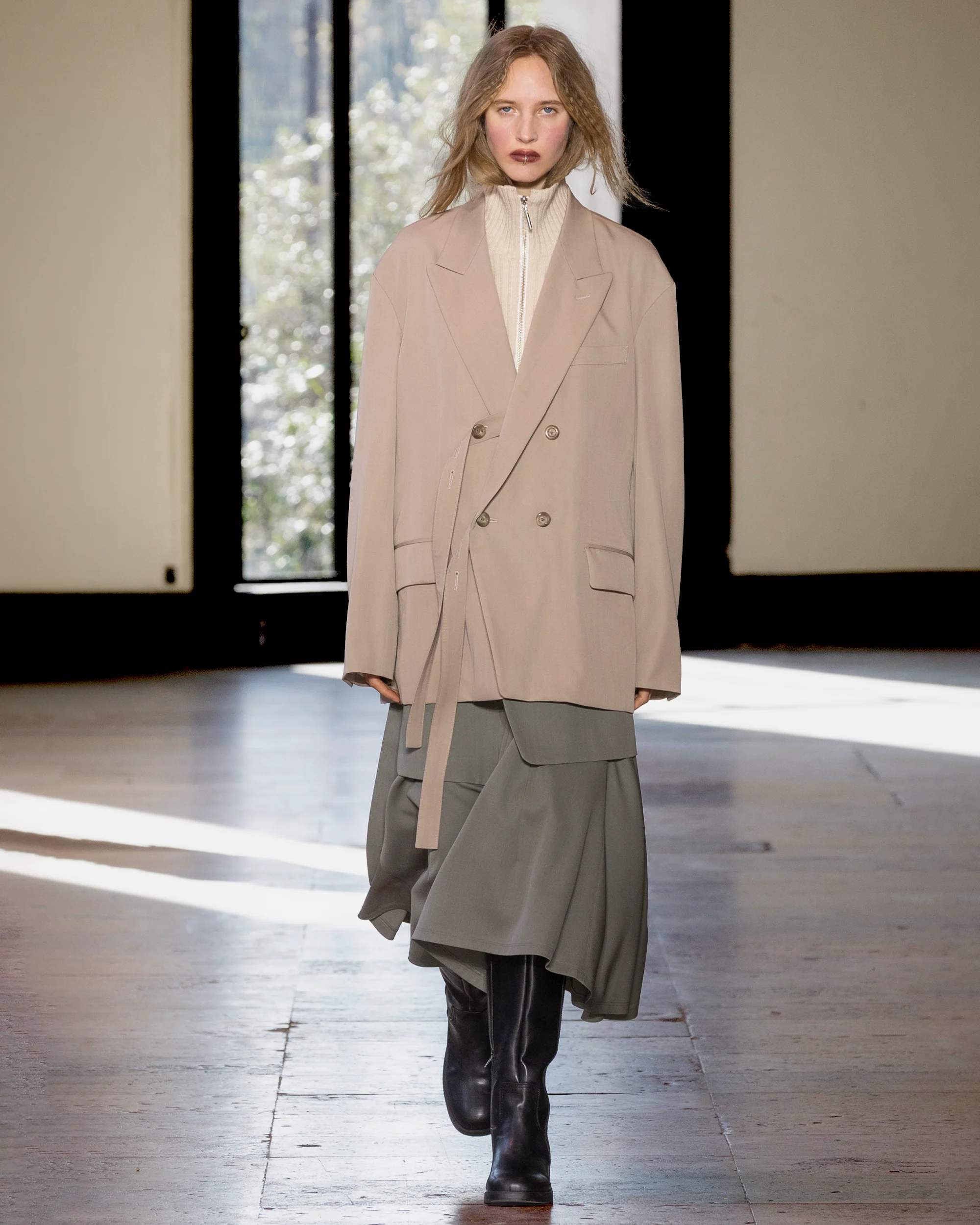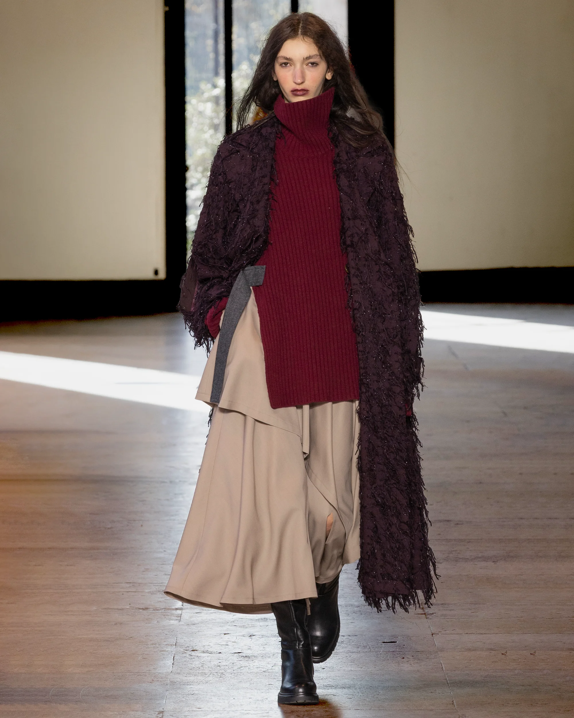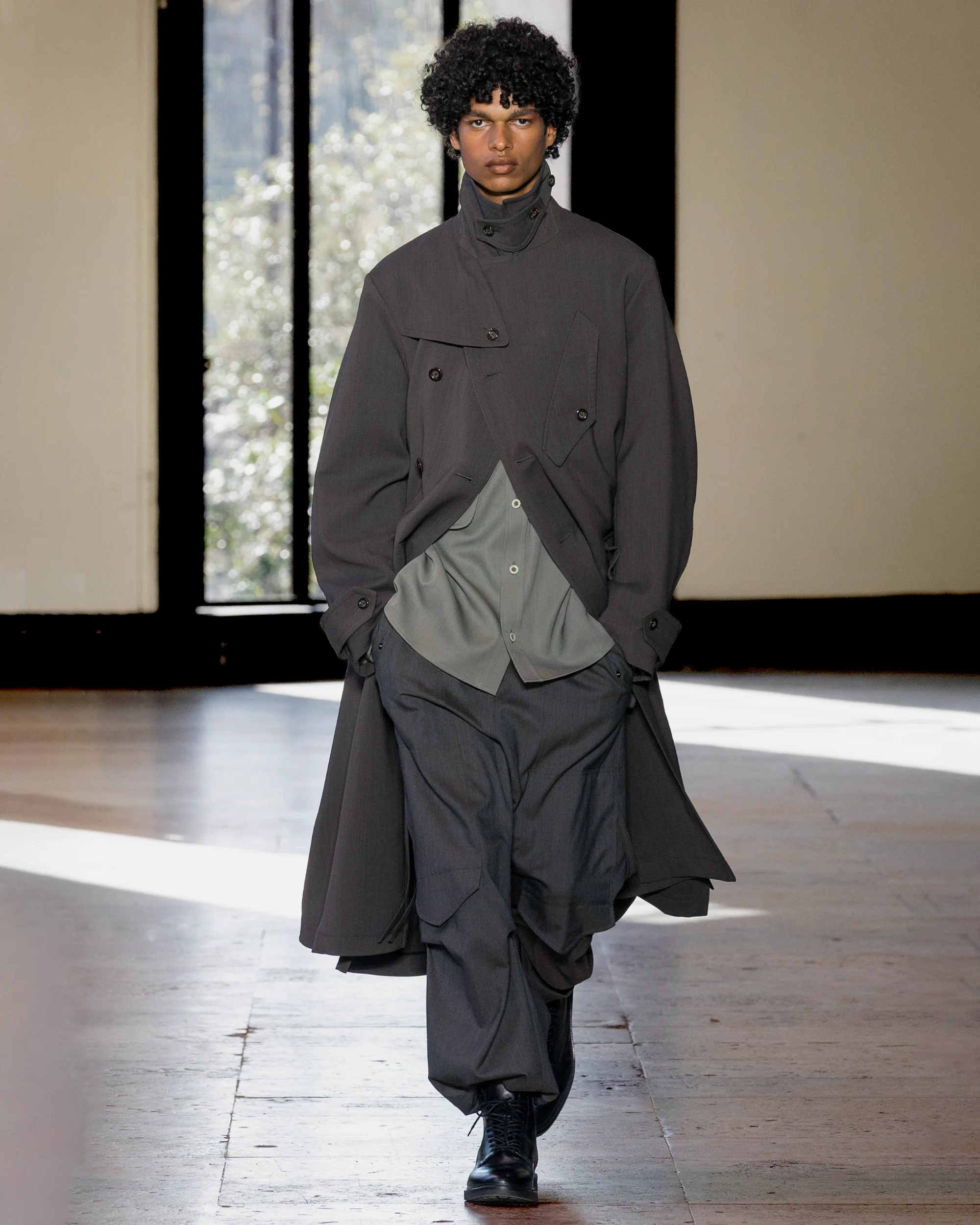 工艺始终是 UJOH 2026–2027 秋冬系列的核心。部分面料于日本采用1960年代的 Schönherr 织机织造,其运行速度远低于现代生产方式,从而增强面料的质感与层次。由此诞生的创新尼龙与轻透材质,既凸显触感,也契合慢时尚理念。