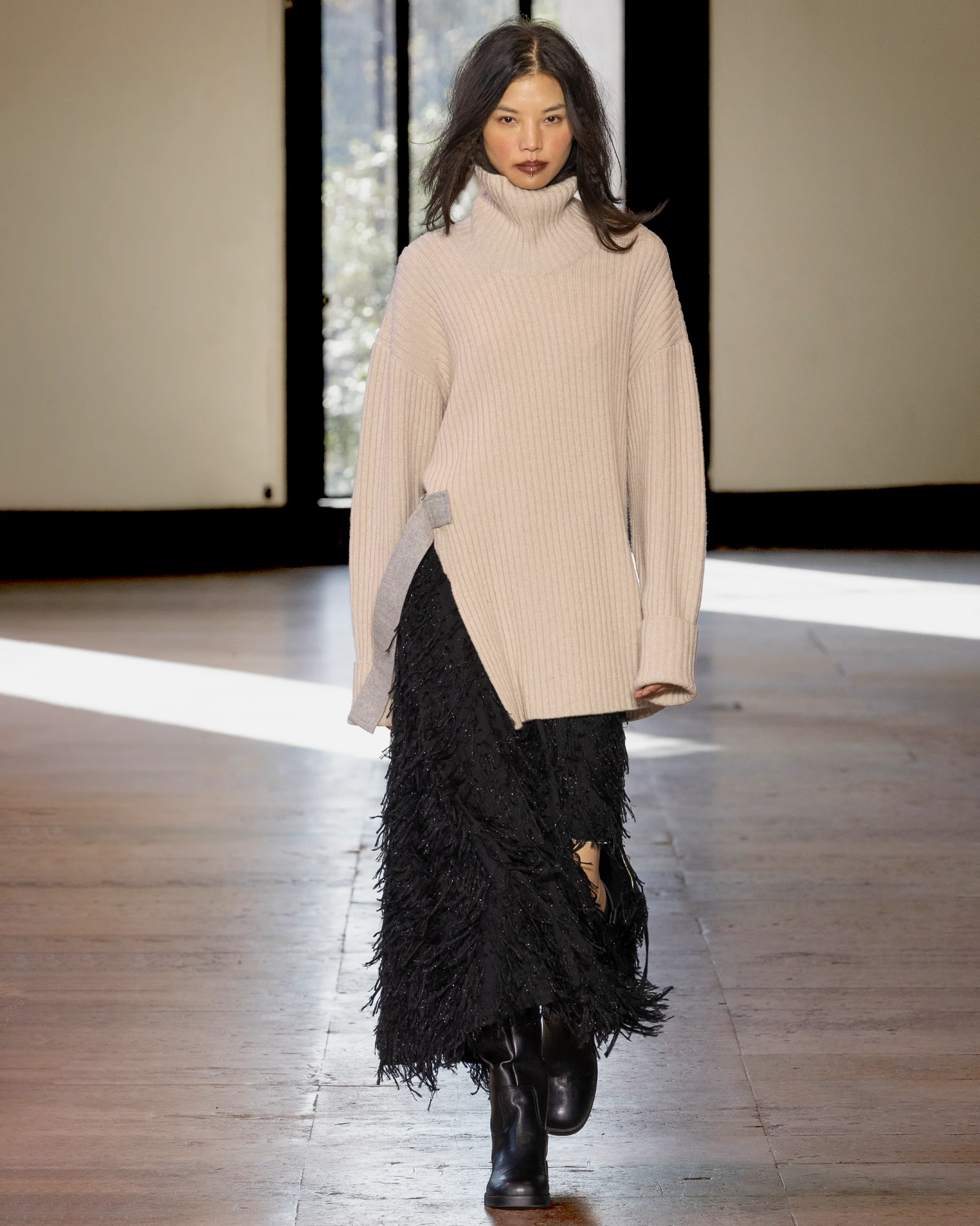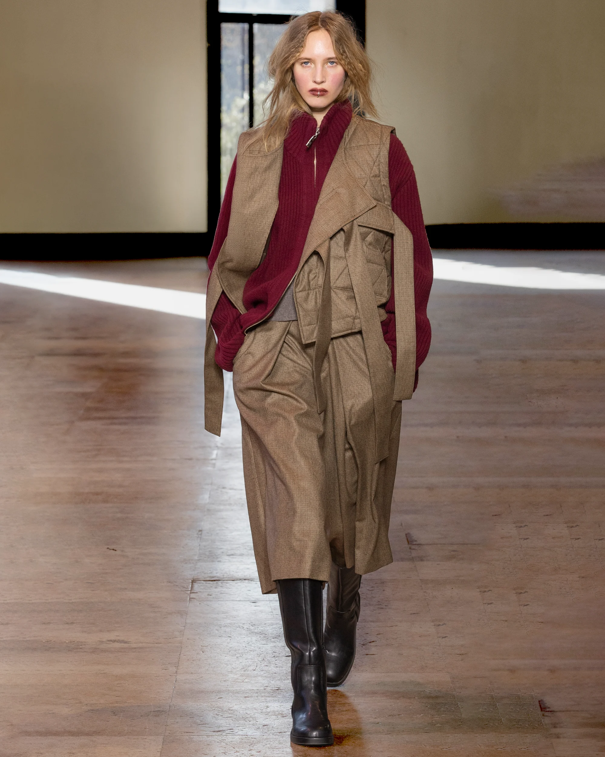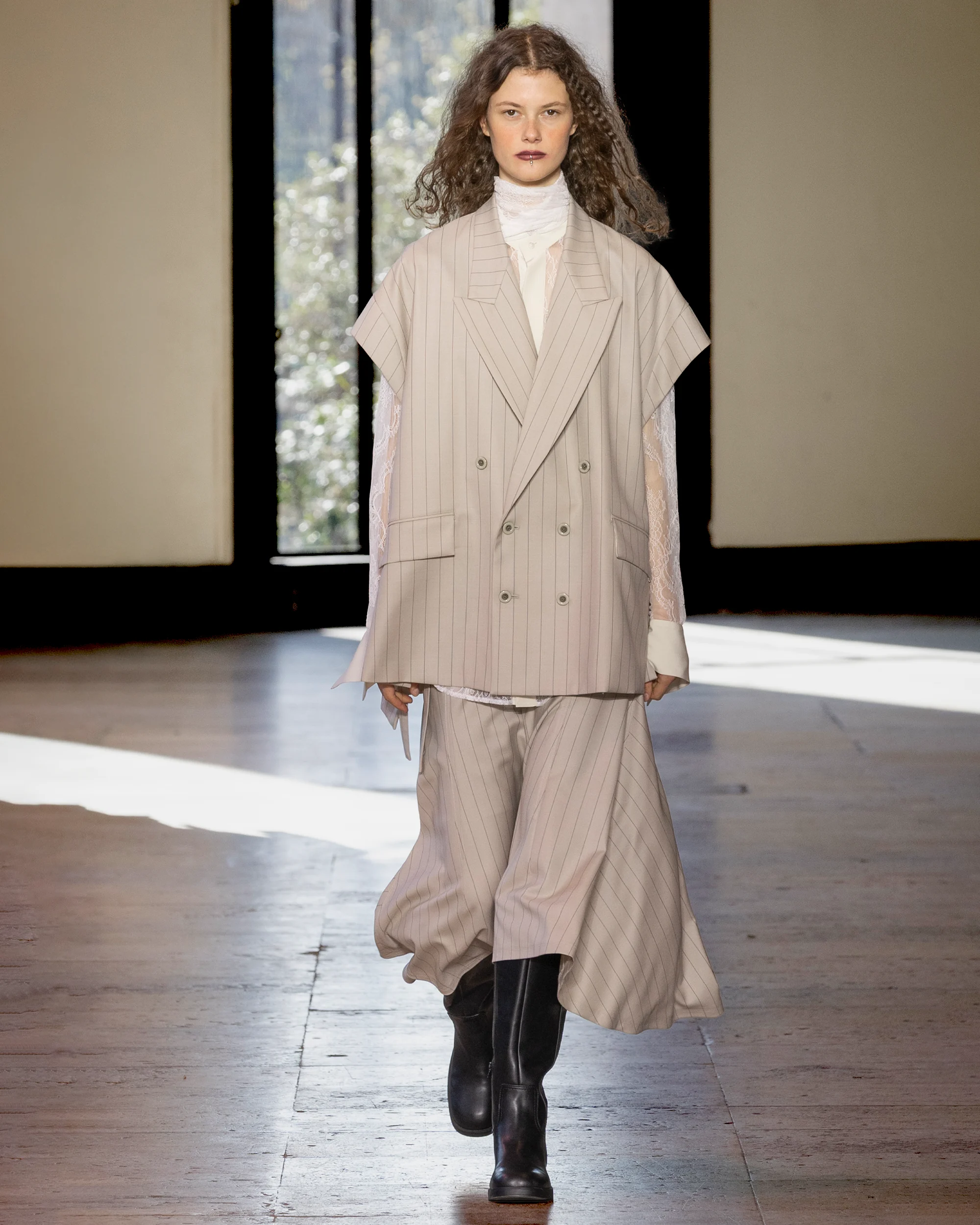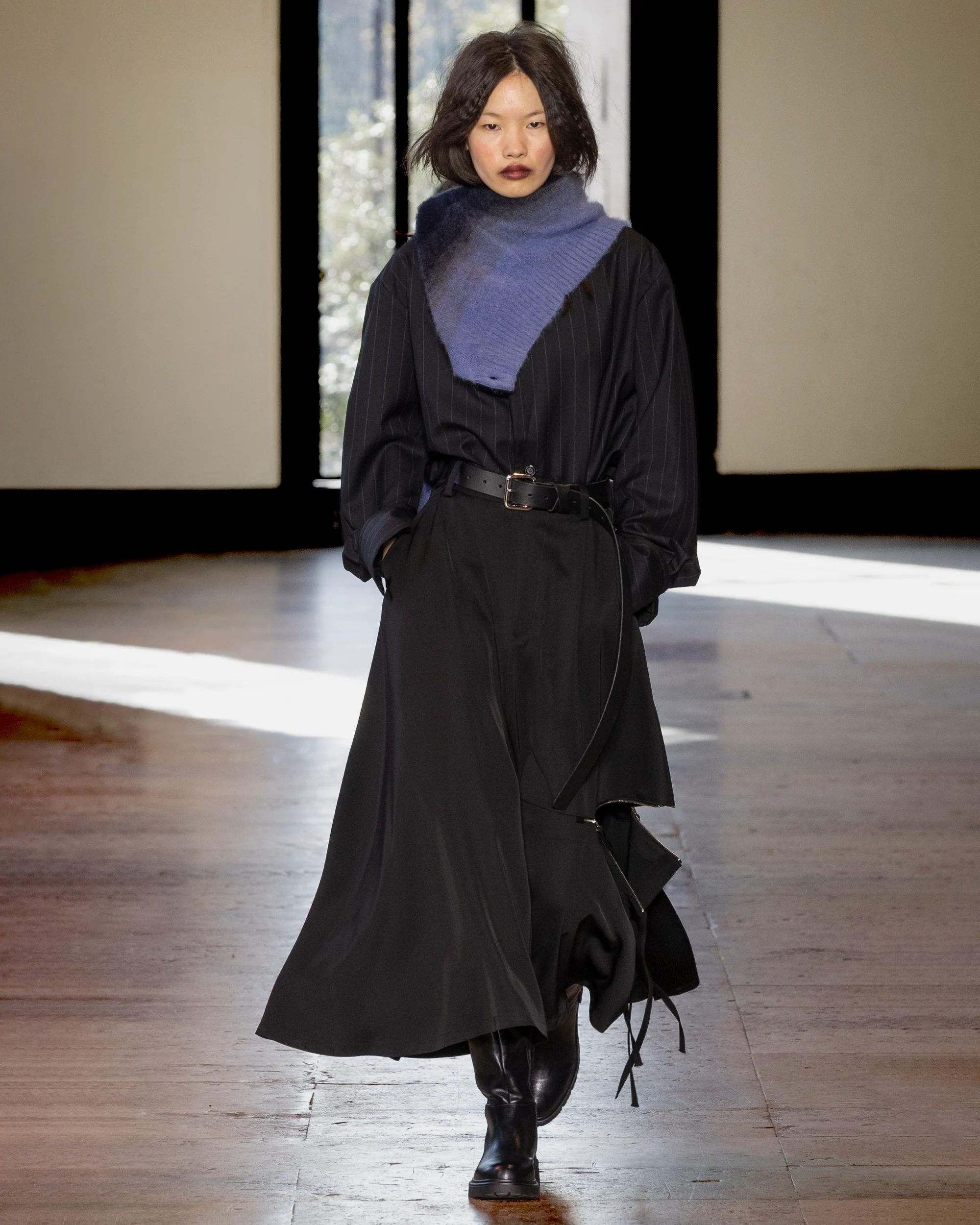 工艺始终是 UJOH 2026–2027 秋冬系列的核心。部分面料于日本采用1960年代的 Schönherr 织机织造,其运行速度远低于现代生产方式,从而增强面料的质感与层次。由此诞生的创新尼龙与轻透材质,既凸显触感,也契合慢时尚理念。